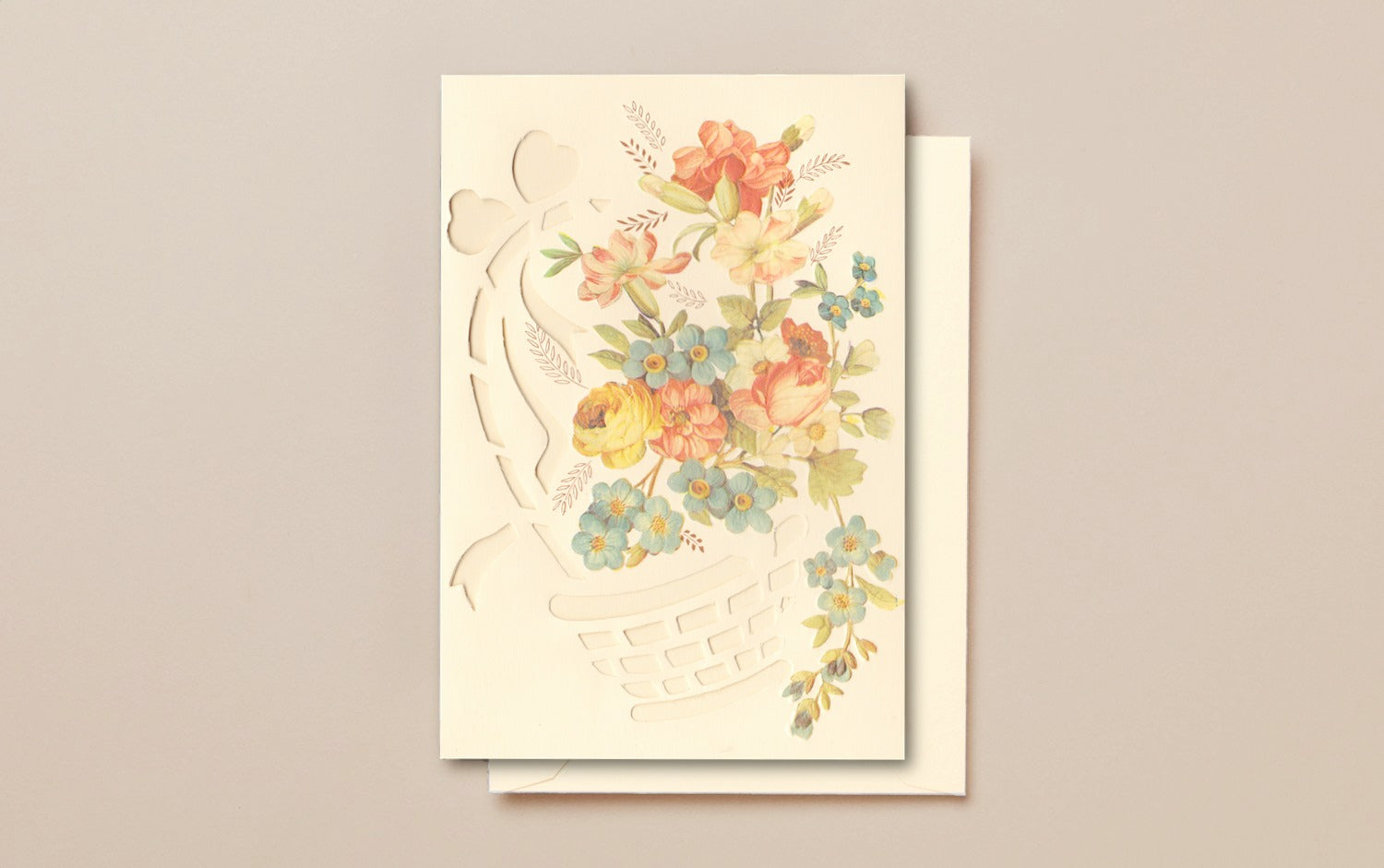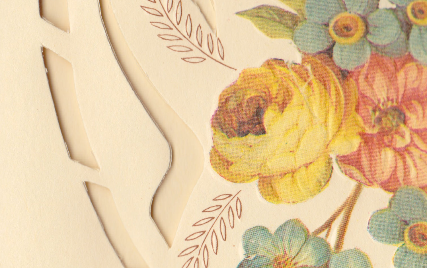 One of a series of die-cut floral cards suitable for any occasion. Each card features a delicately cut cover giving a peek at the message inside.