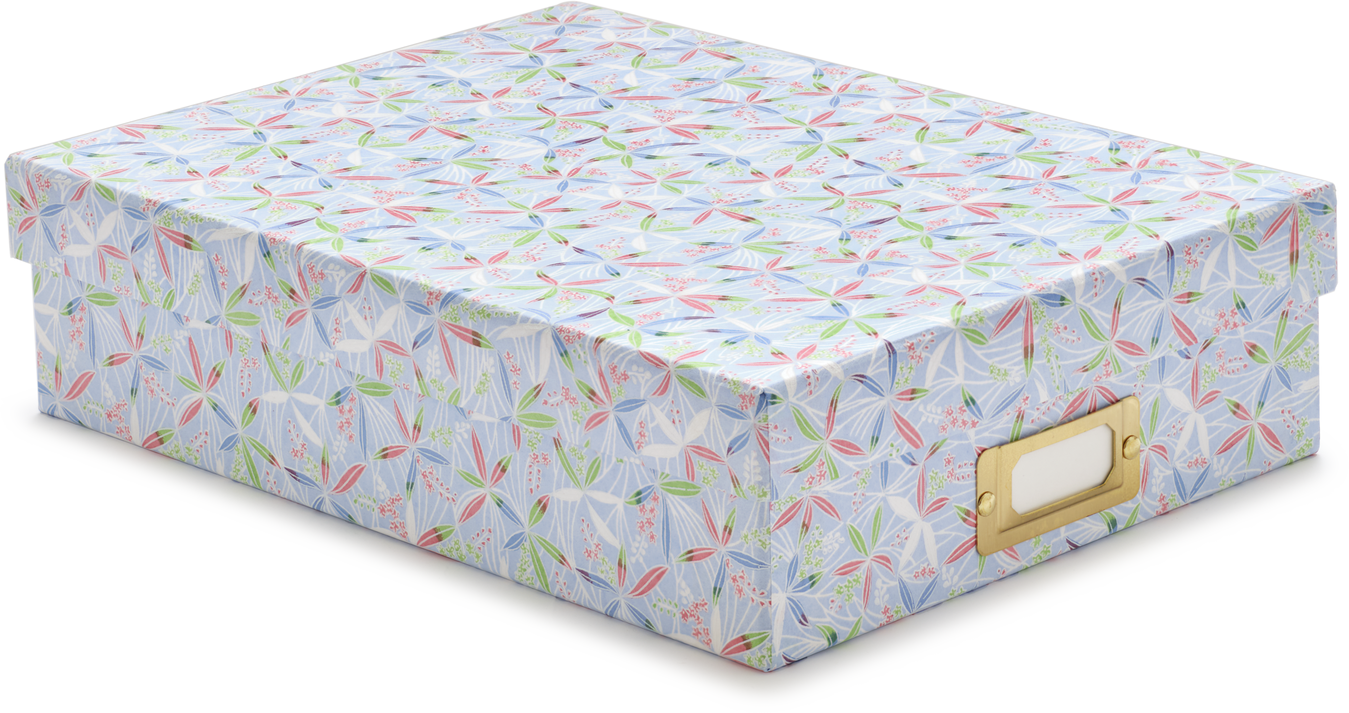 Handmade archival box, with Japanese paper motifs, lined inside (with creme paper) and using hand silk screen paper to cover. There is also a brass label holder on each box to make note of its contents.