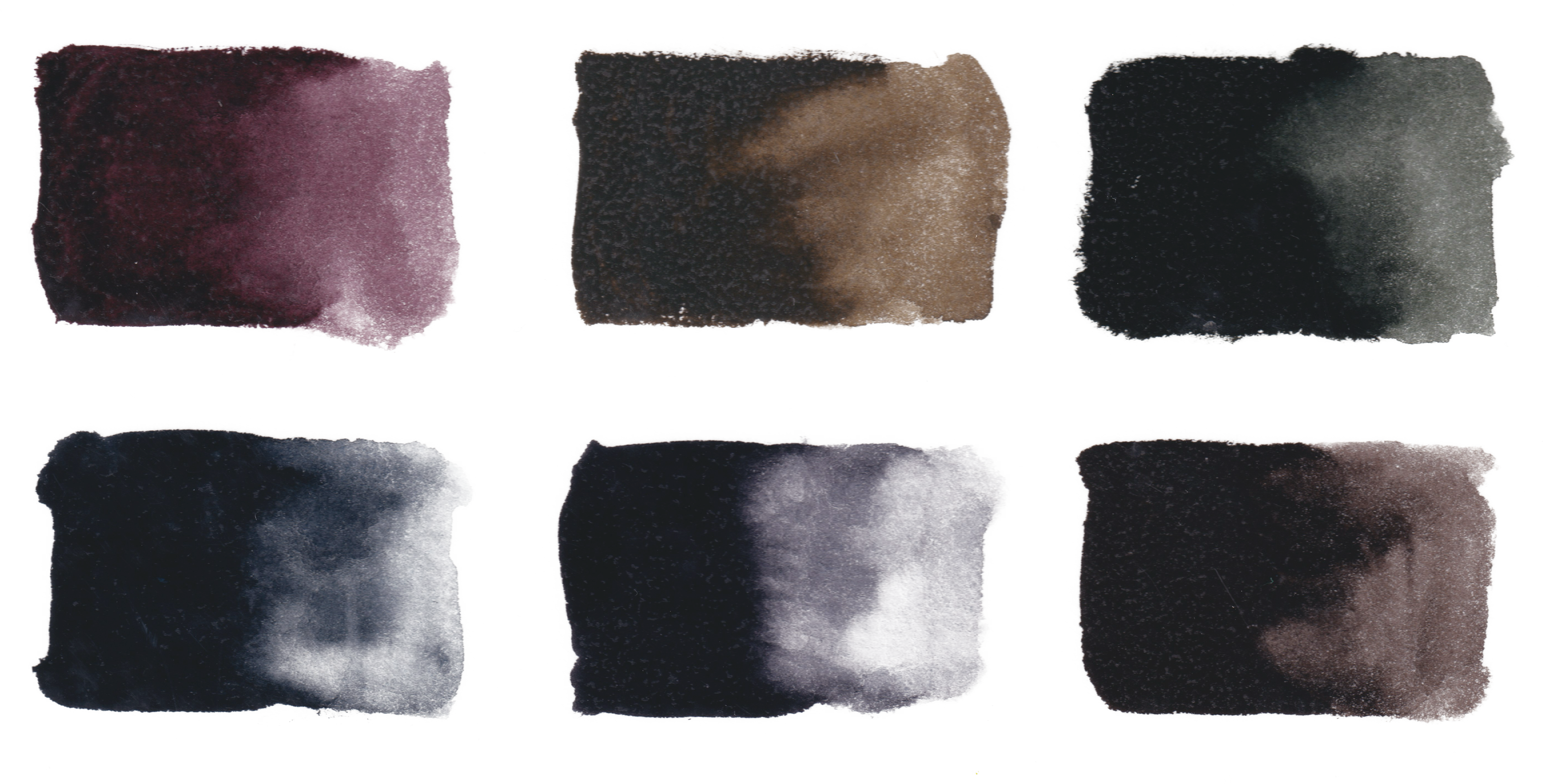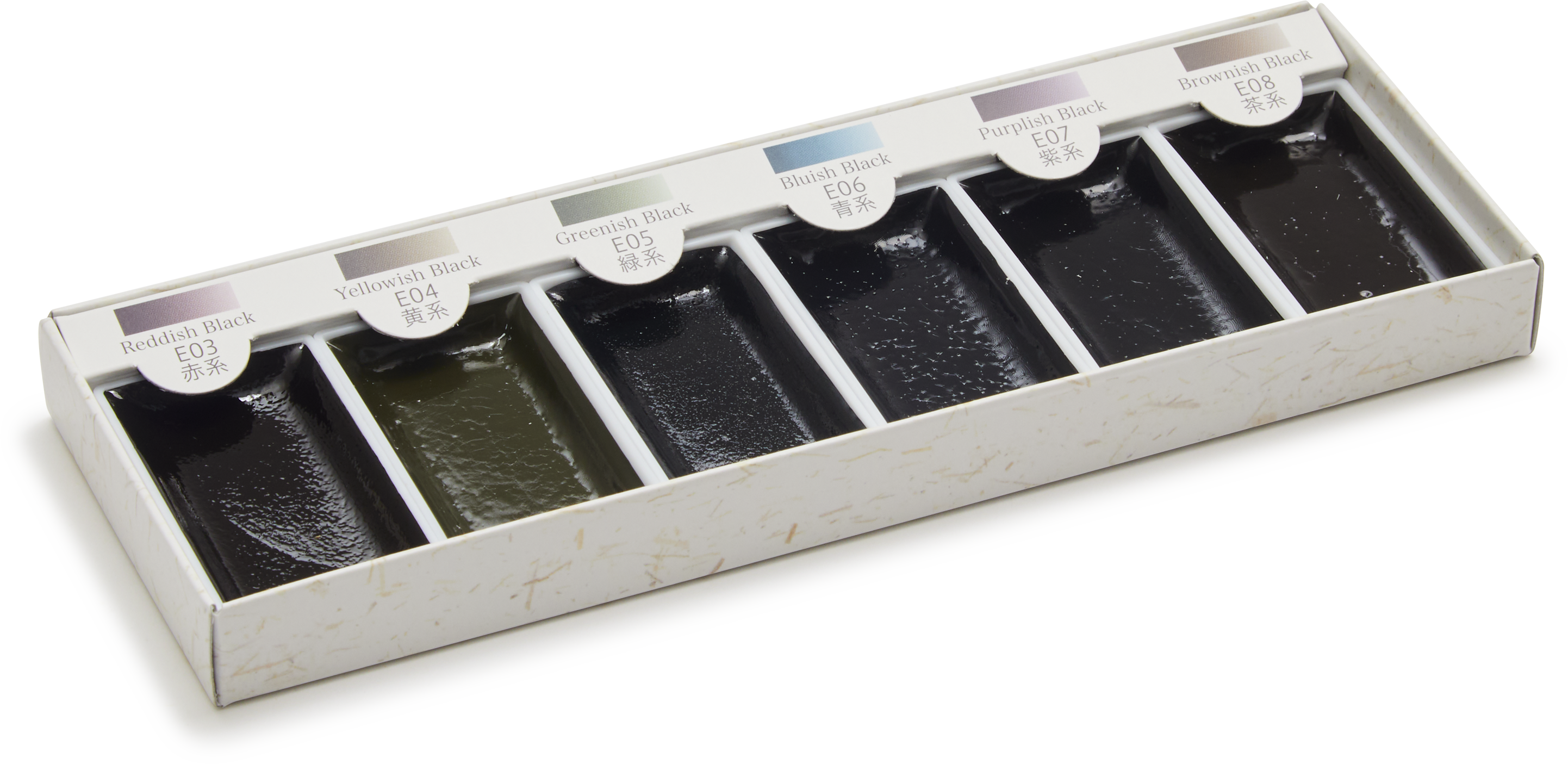 Sumi-e, literally translating to 'black ink painting', is commonly used in Japanese calligraphy, Shodō. Traditionally this technique would use an Indian ink bar mixed with water to create varying shades of black, but is here transformed into an easy to use palette which holds a great range of tonality for soft or dramatic effect.