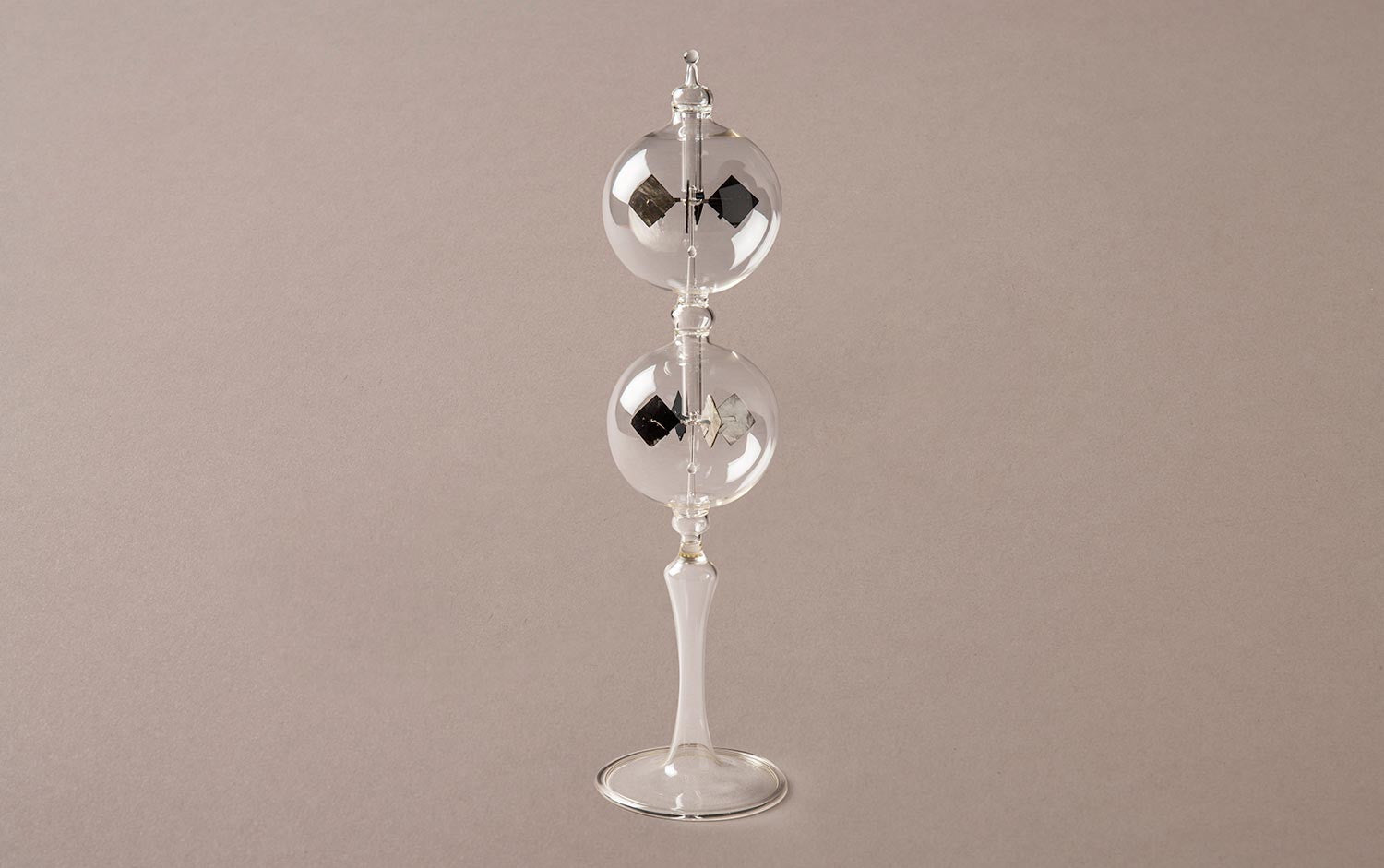 The light mill consists of an airtight glass bulb, containing a partial vacuum. Inside are a set of vanes which are mounted on a spindle. The vanes rotate when exposed to light, with faster rotation for more intense light, providing a quantitative measurement of electromagnetic radiation intensity.