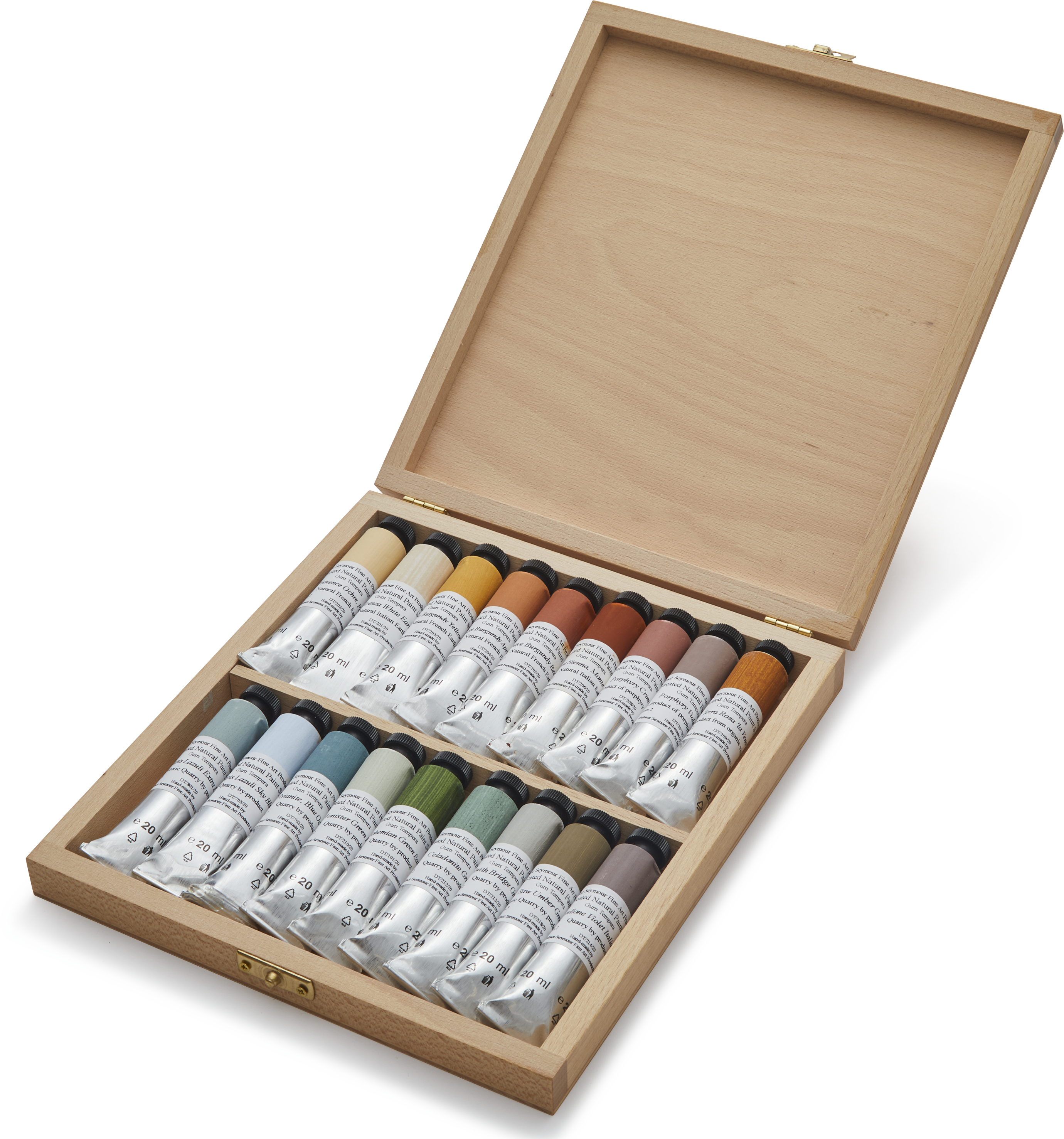 From the studio of our most respected pigment experts, Pip Seymour and Rebecca Wallace, we are pleased to offer this professional grade oil paint box. In the face of declining quality due to mass manufacturing, as artists themselves, they began making paints to their own tastes and recipes looking to emulate art materials from the past, with more individuality and natural appearance.