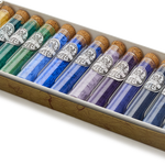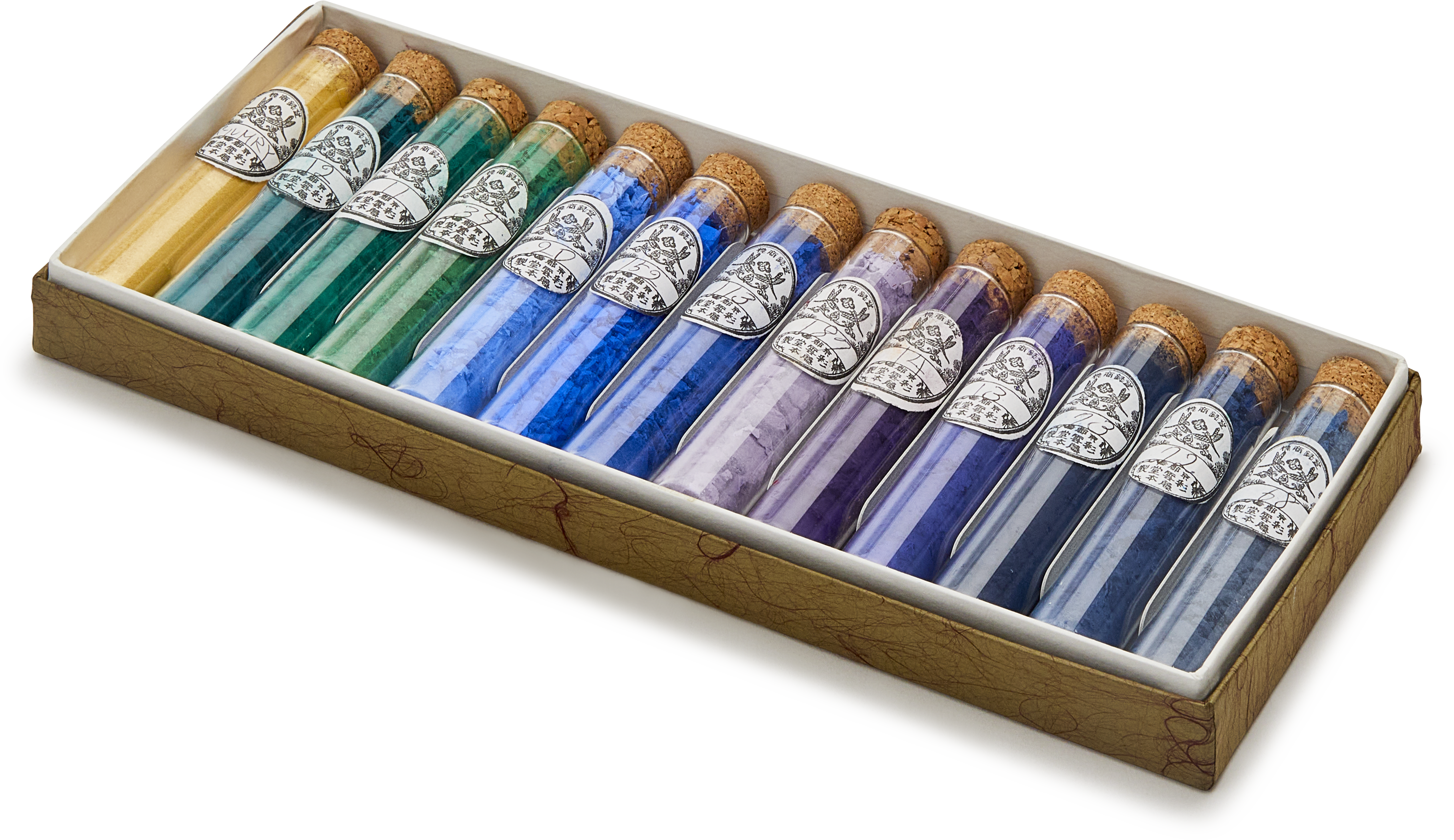 Following our comprehensive set of Japanese mineral pigments, we are pleased to offer this set of 13 mineral pigments devised specifically to paint Japanese blue irises.