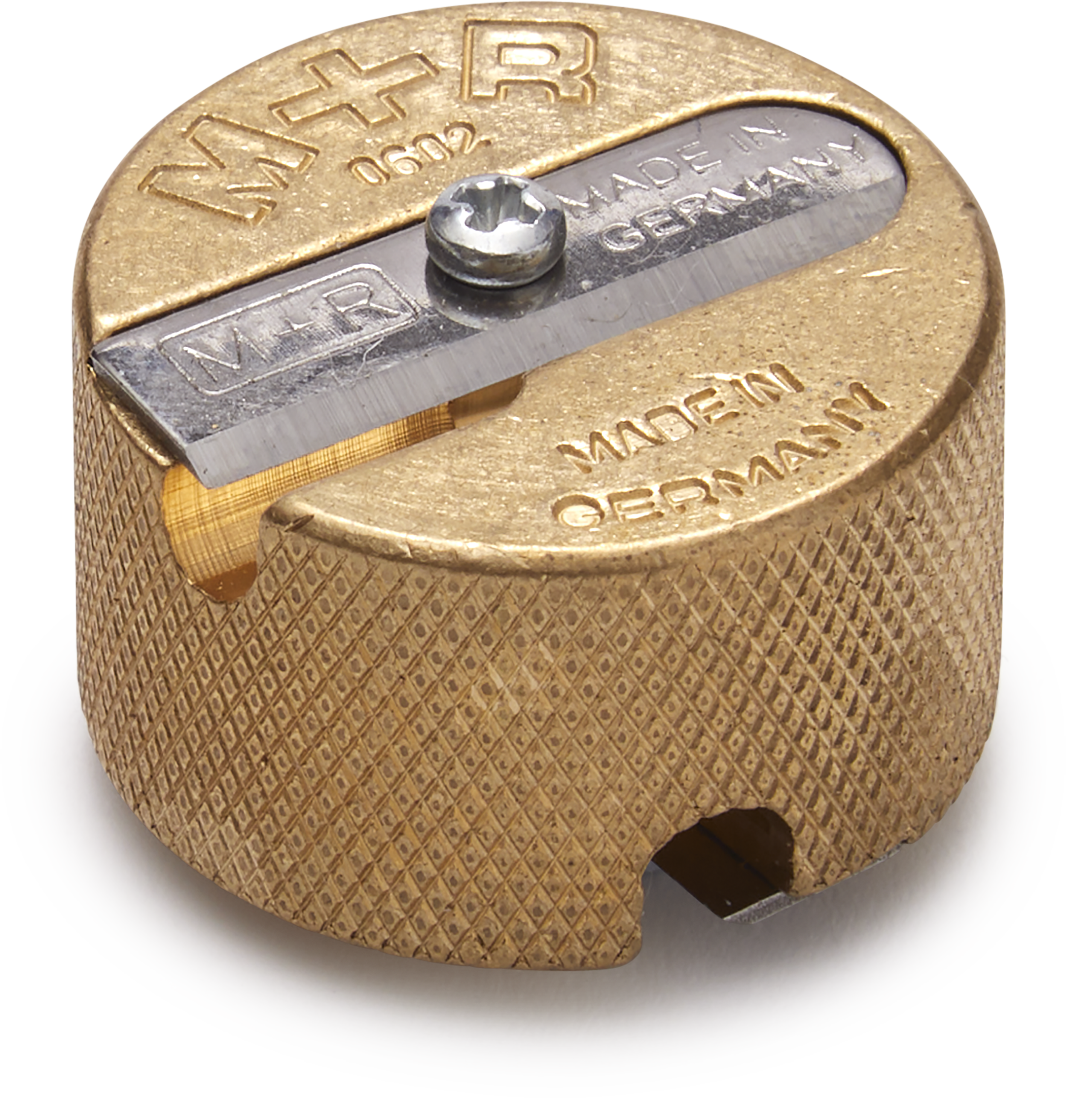 Beautiful for the simplicity of its shape and functionality - this solid double brass sharpener is virtually indestructible.    Our research on stationery traces this design back to at least 1957—it is still produced today in the same German factory.