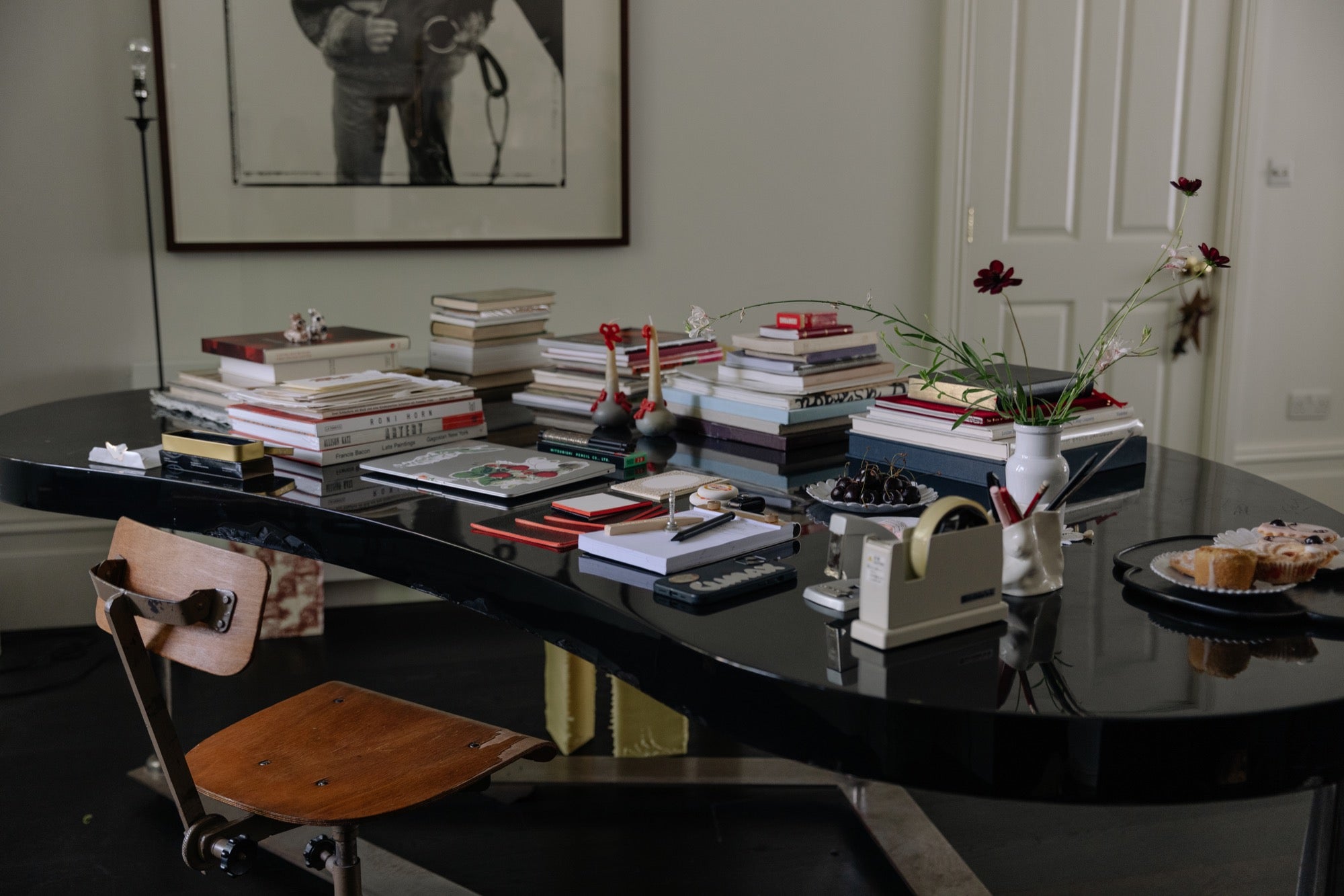Like the space it inhabits, the fashion designer Simone Rocha’s desk is recognisably hers. Flanked on both sides by imposing Victorian vestry cupboards and festooned by a four-tiered French crystal chandelier, the lacquered black table, gleaming like a pool of ink, holds...