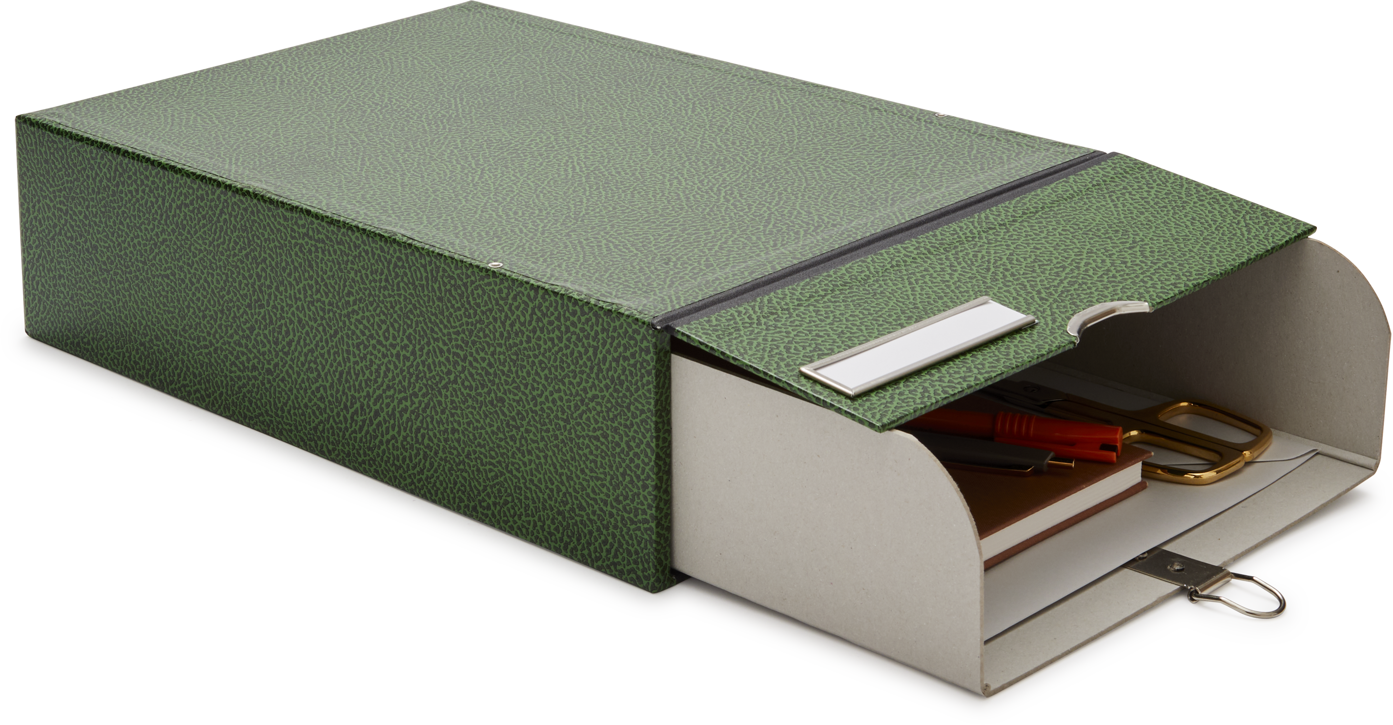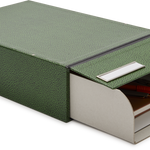 A new addition to our in-house range, please meet the ultimate box for your archival needs. The outer construction is completely rigid - unclip the front chrome fastener and out comes a drawer to contain documents and other bits - push the drawer back in and everything is neatly stored back in.