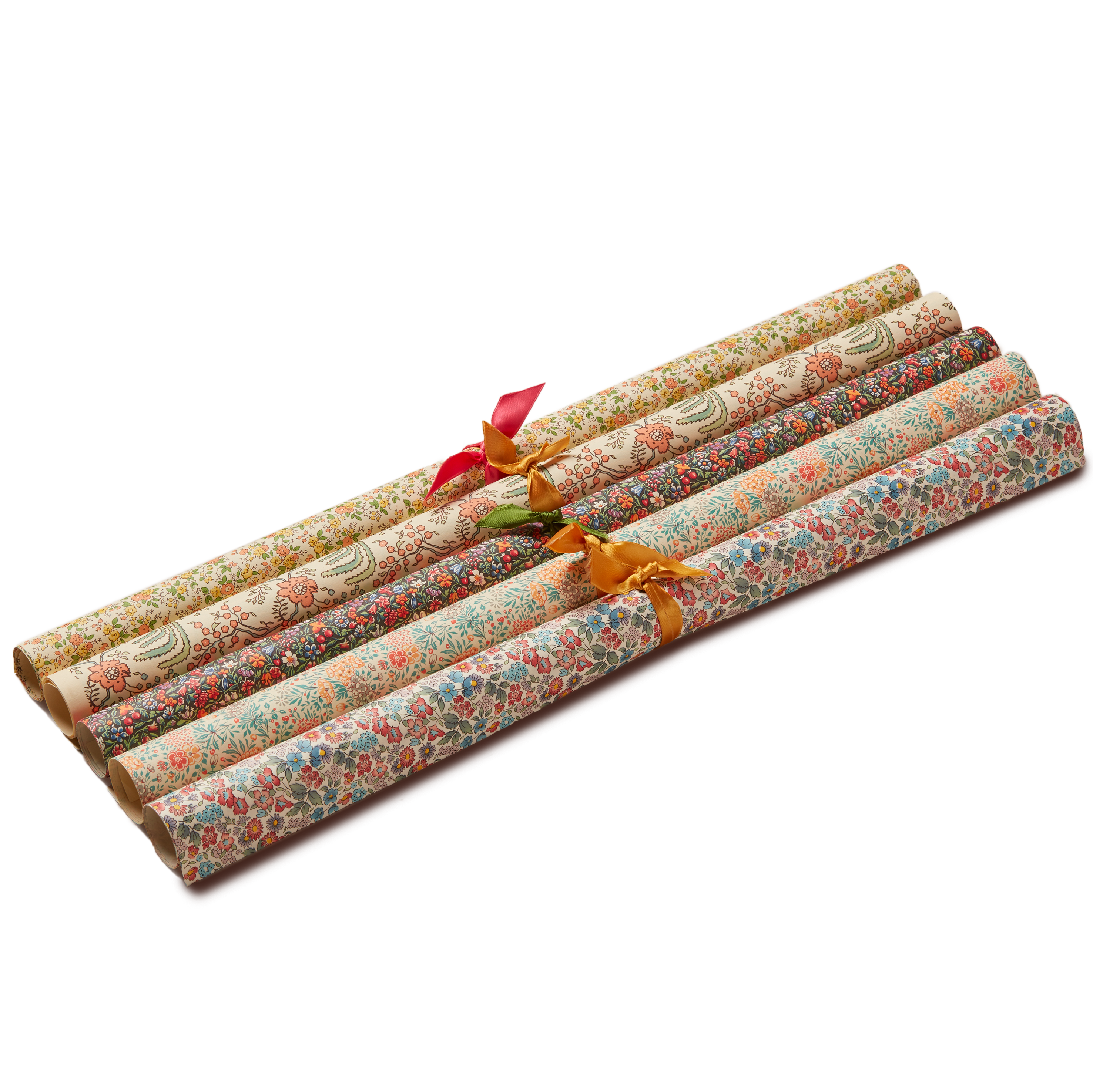 An assortment of fine wrapping paper, in a variety of floral patterns.