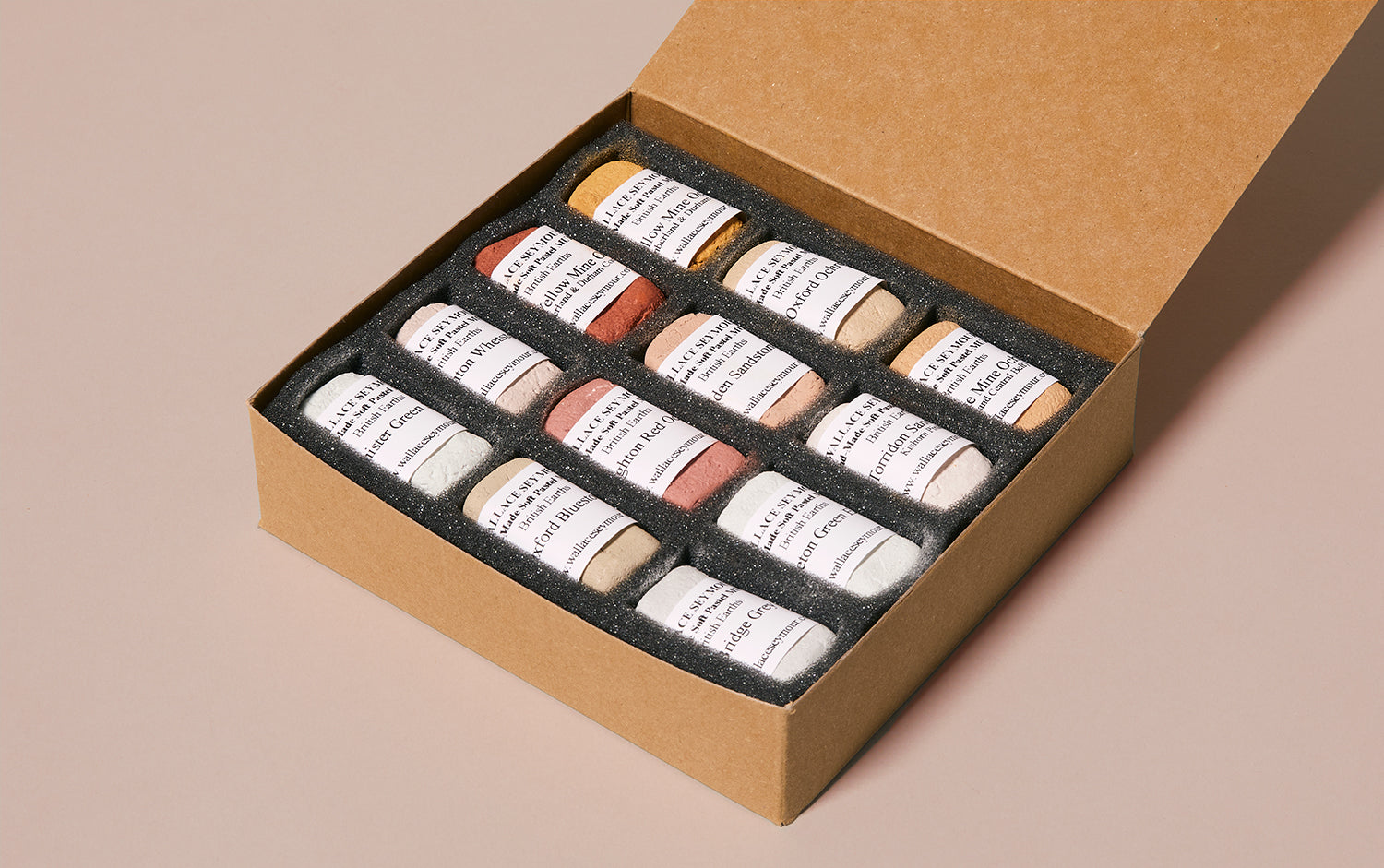With this in mind, this set has been created exclusively for Choosing Keeping. 12 colours made to recreate the feel and chromatic identity of native British soil types like the Northumberland & Durham Coalfield which inspired the colours Yellow Mine Ochre and Burnt Yellow Mine Ochre.