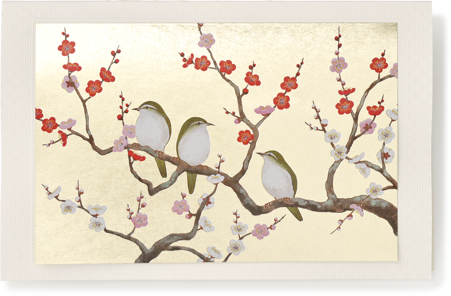 This greeting card features a shining illustration of a birds perched on a branch and cherry blossoms. This handmade type of expert printing makes for a very attractive sparkling and metallic finish, poetic for any occasion.