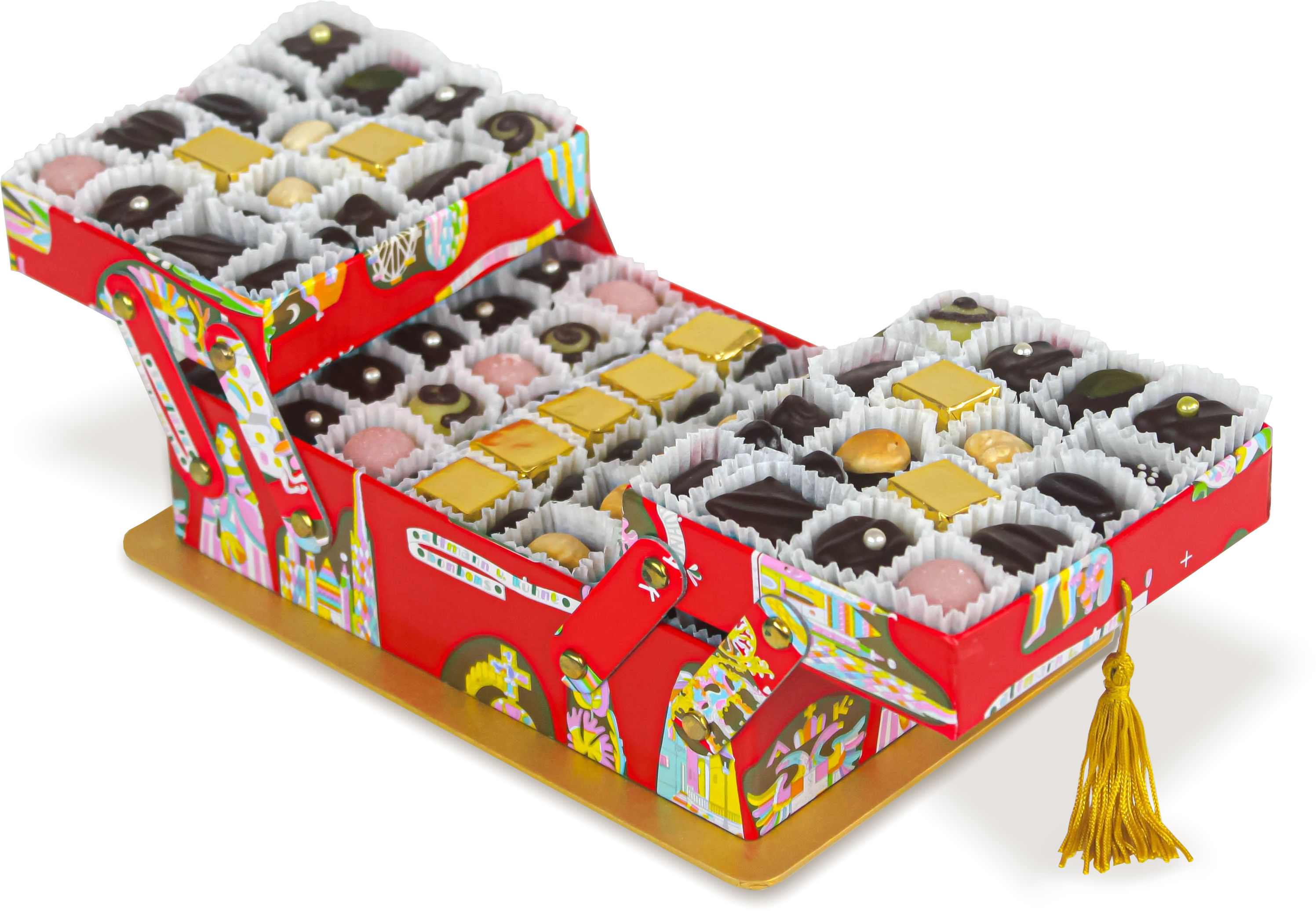 Material: Chocolates, paper box with hinging mechanism, fabric tassels