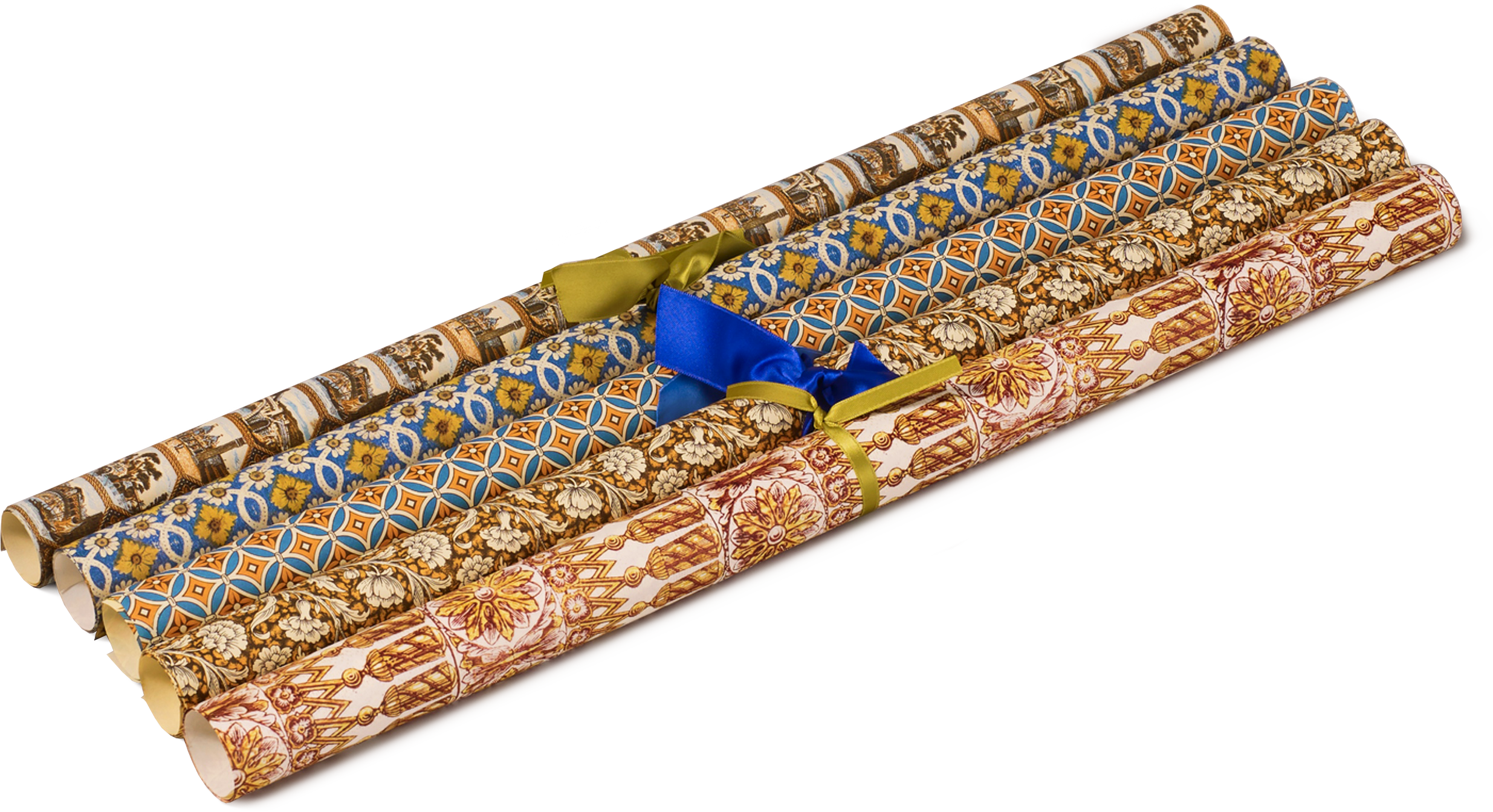 An assortment of fine wrapping paper, in a variety of Remondini style patterns.