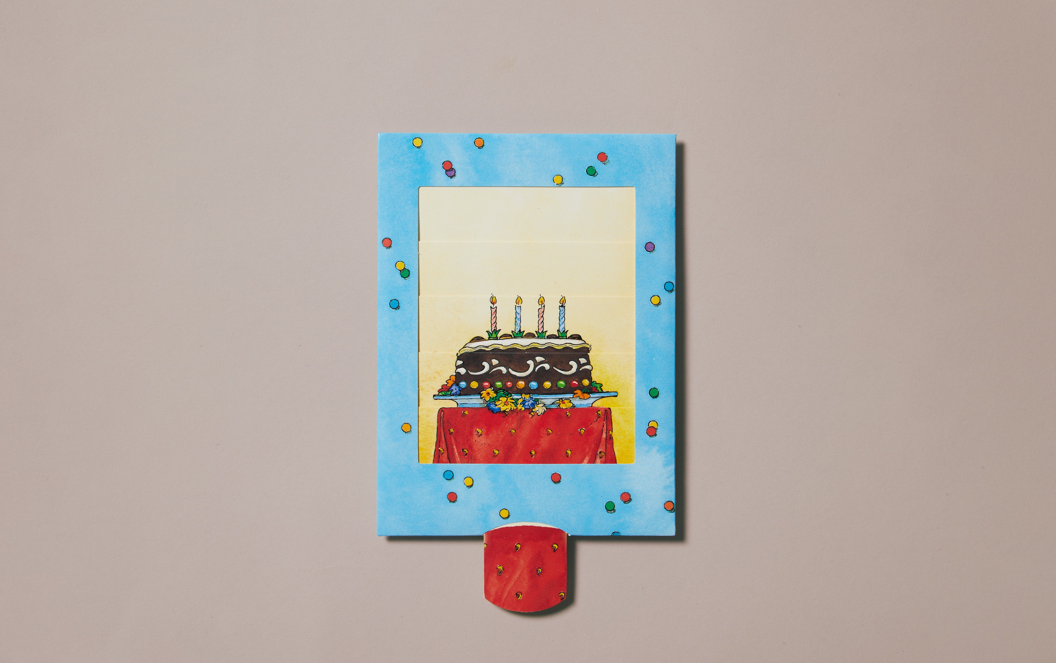 Flour, eggs, sugar, butter, time... Pull down on the tab of this "venetian blind" card to reveal a cheerful birthday cake. Ideal for a birthday, this flat card is blank on the reverse to write your message.