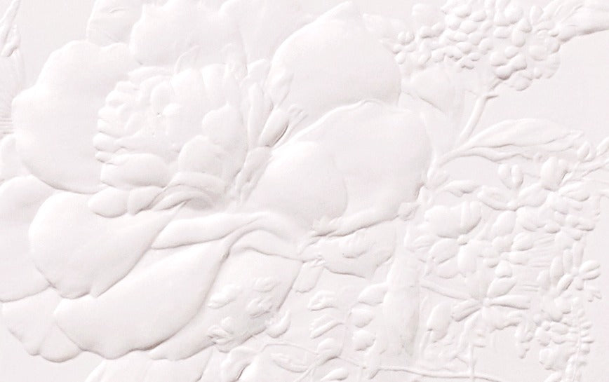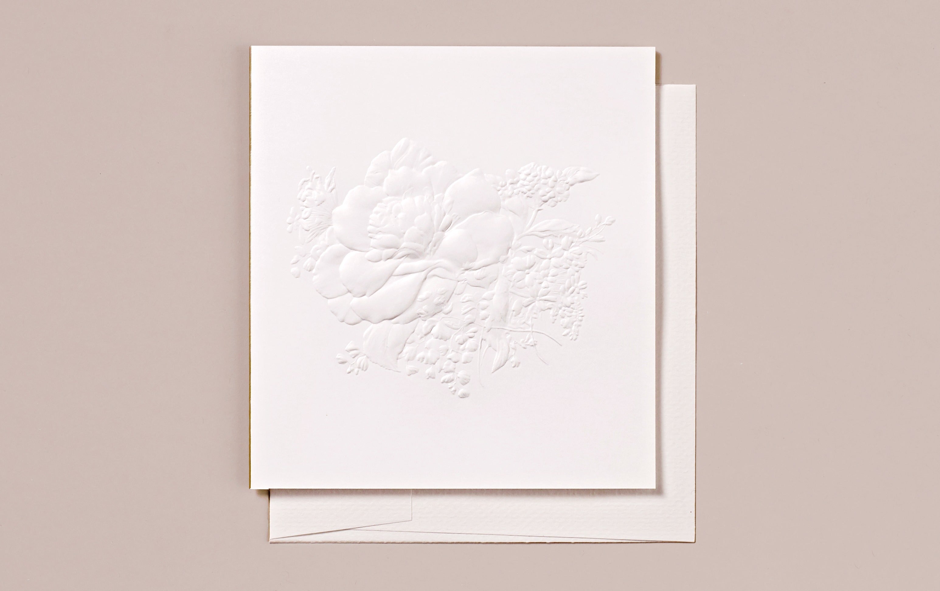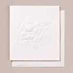 A white on white, beautifully hand blind embossed card and its matching envelope. The camellia is symbolic of love and adoration, making this a perfect card for a loved one or marriage.