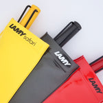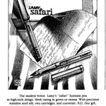 Originally designed in 1980 with young people in mind, this pen addressed the specific functional needs for classroom use and painstakingly integrating such features into the design : namely resilience to breakage and ergonomics. 'User experience' was at the centre of the design process and words like "adventure" and "freedom" set the tone for the pen's spirit and now so aptly encapsulates the values Lamy stands for. The distinct triangle shaped grip (to help with correct finger and hand posture) to facilitate long periods of effortless writing ; its signature study metal clip, fit to withstand high levels of wear and tear ; the flat side of the barrel, which stops the pen from rolling away ; the practical window for checking the cartridge ink level are features which make the Safari a workhorse of a pen sold a very affordable price.