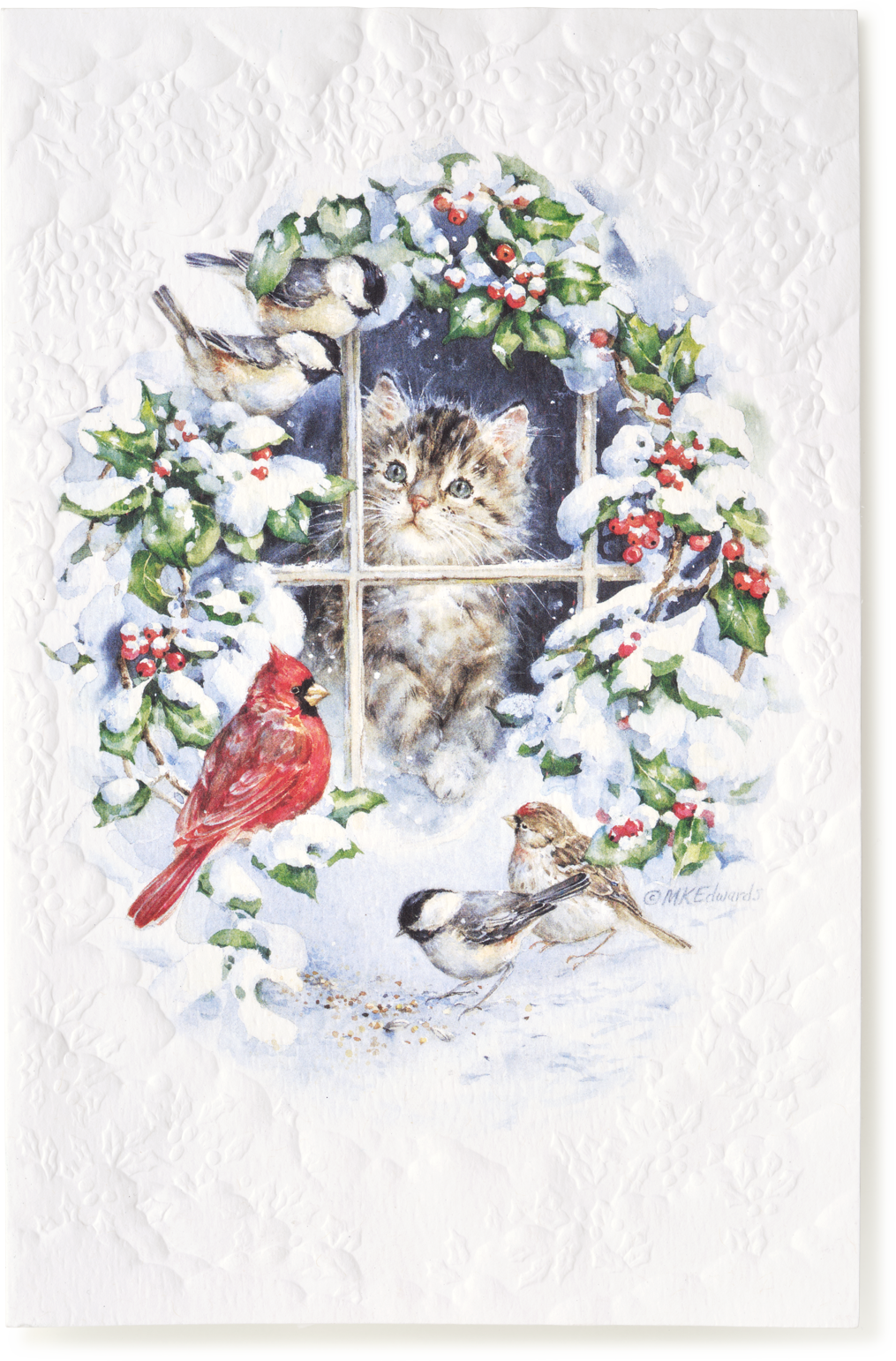A new addition to our Christmas card assortment - of course we can't resist when cats and Christmas come together! A sweet little kitten peering out of the window into the snowy outdoor and two friendly and quintessentially American birds, the red Cardinal and cute Chickadee. On the printing side, features deep blind embossing evocative of the snowy silent landscape.