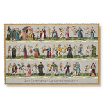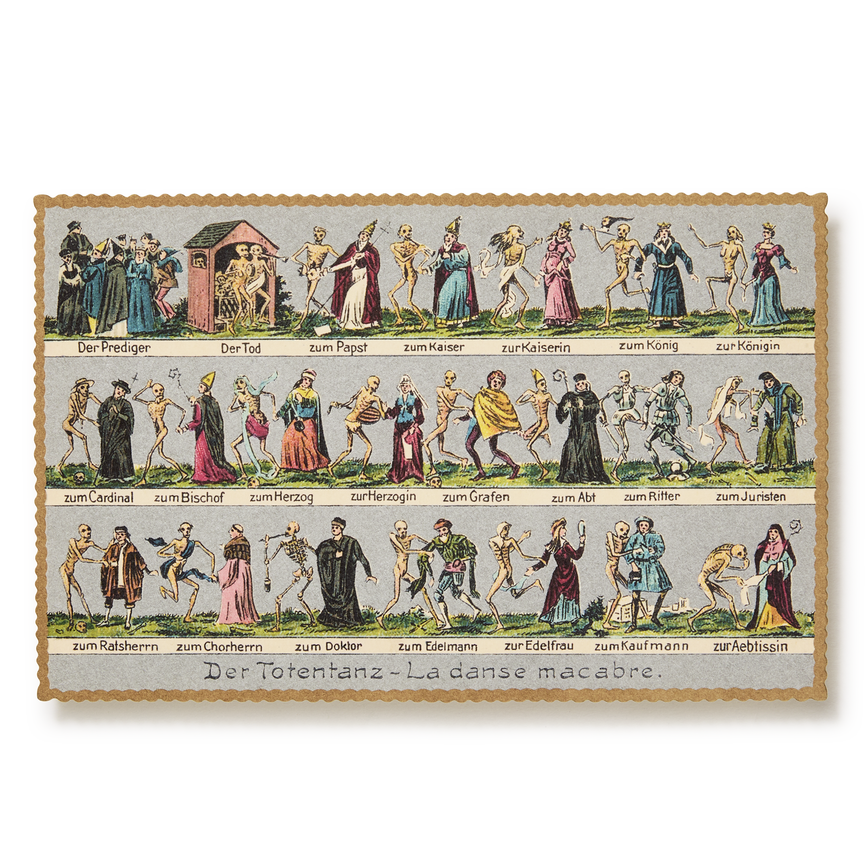 This postcard draws on the medieval motif of the Danse Macabre, a reminder of life’s transience rendered through wit and ornament. Taken from the Choosing Keeping extensive collection of ephemera, we have worked carefully to match the distinctive colour palette and texture of the original into a faithfull reproduction, perfect for sending as a small note, framing as part of a gallery wall, or accompanying a gift with a touch of dark romanticism.