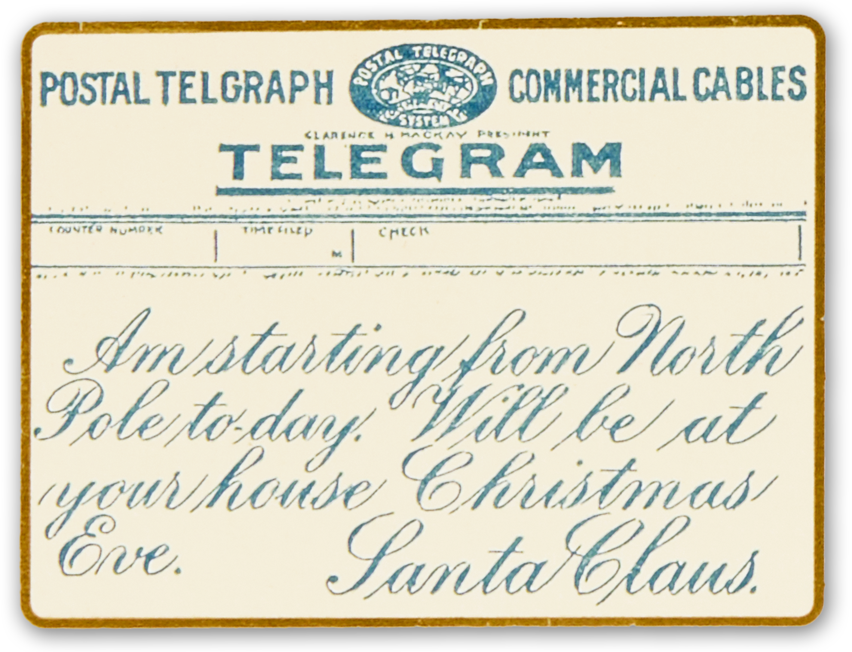 Reads: "Am Starting from North Pole today. Will be at your house Christmas Eve, Santa Claus"