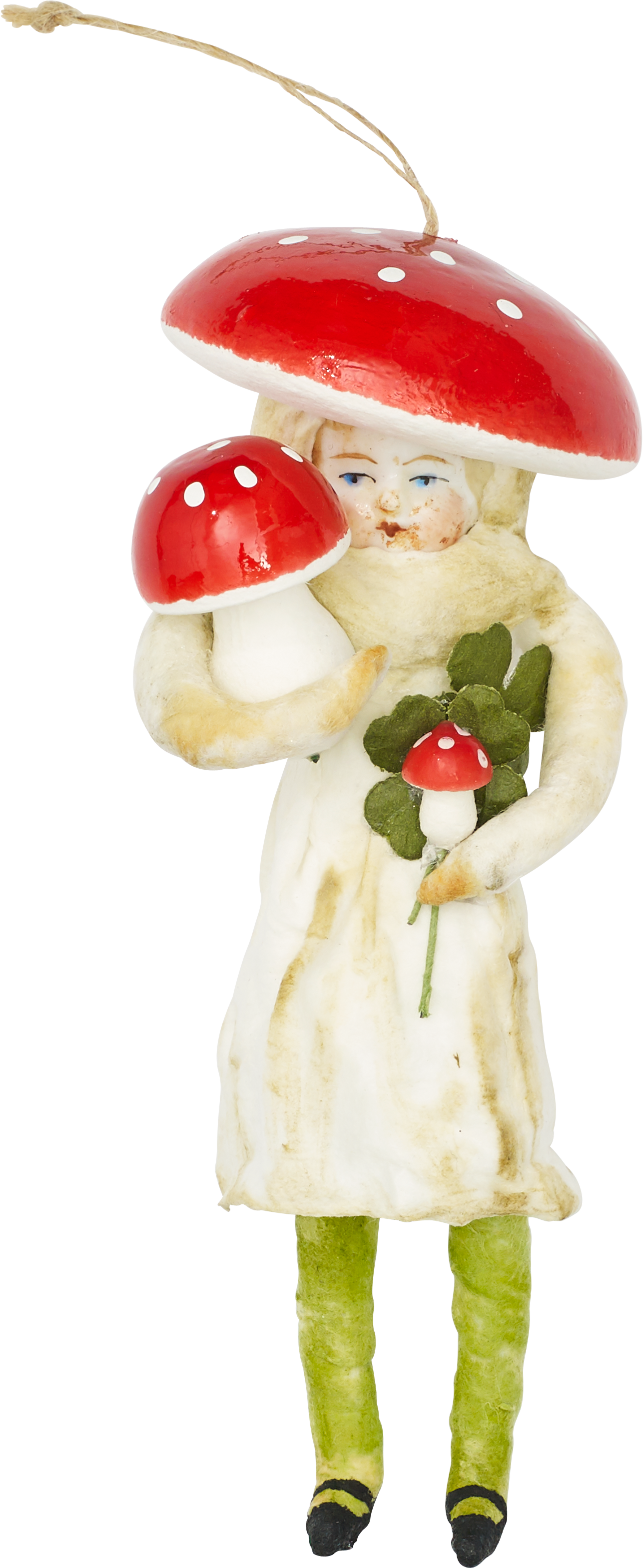 These Spun Cotton Dolls are faithful replicas of ornaments from a bygone era - originating in 19th and early 20th century Germany. These were made by hand with cotton wadding around wire shapes and adorned with Dresden scrap embossed papers and other hand fashioned props, often featuring mushrooms Gluckspilz, a little trinket for luck. The porcelain faces used are original antique doll parts, which are extraordinarily secured some 100 years after they were disposed of as second quality or faulty by the doll makers of the past in the local village woods somewhere in Eastern Germany. Today in one of the strangest weekend hobbies, these are dug up like treasure by locals, or porcelain-foragers as we like to think of them, for your enjoyment. Surely the fact that each face has been buried in dirt for decades, destined to be forgotten, and brought back to life, given a new body and clothes, adds to their very eery, sometimes outright frightening demeanour and kooky form.