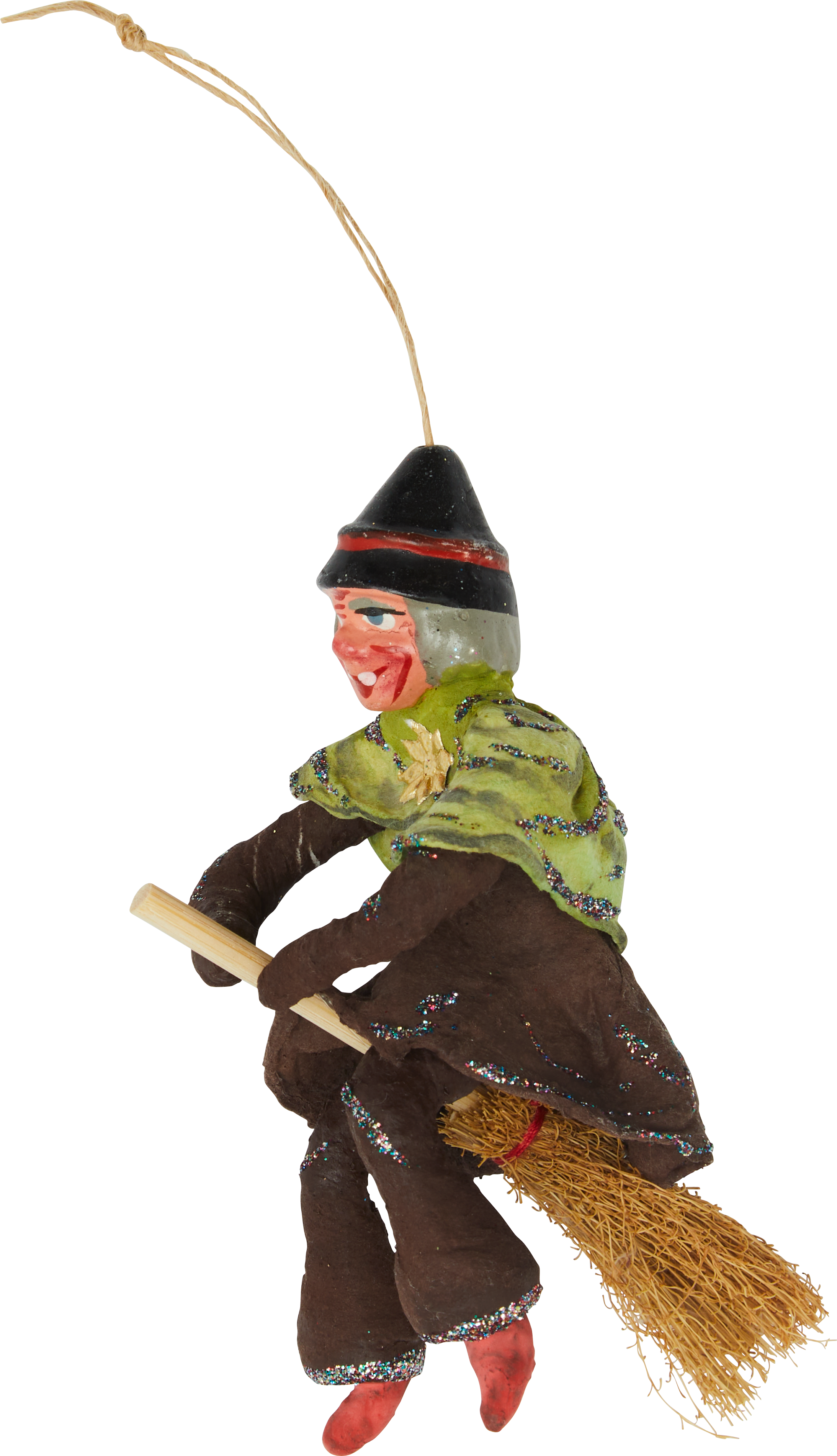 These Spun Cotton Dolls are faithful replicas of ornaments from a bygone era - originating in 19th and early 20th century Germany. These were made by hand with cotton wadding around wire shapes and adorned with Dresden scrap embossed papers and other hand fashioned props, often featuring mushrooms Gluckspilz, a little trinket for luck. The porcelain faces used are original antique doll parts, which are extraordinarily secured some 100 years after they were disposed of as second quality or faulty by the doll makers of the past in the local village woods somewhere in Eastern Germany. Today in one of the strangest weekend hobbies, these are dug up like treasure by locals, or porcelain-foragers as we like to think of them, for your enjoyment. Surely the fact that each face has been buried in dirt for decades, destined to be forgotten, and brought back to life, given a new body and clothes, adds to their very eery, sometimes outright frightening demeanour and kooky form.