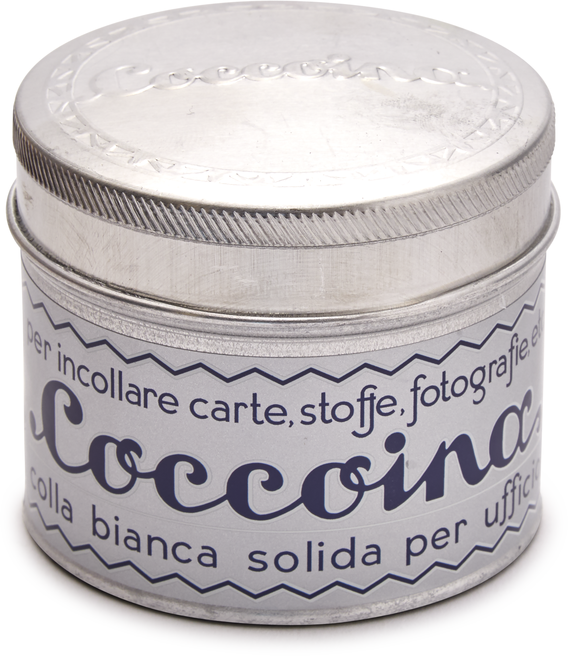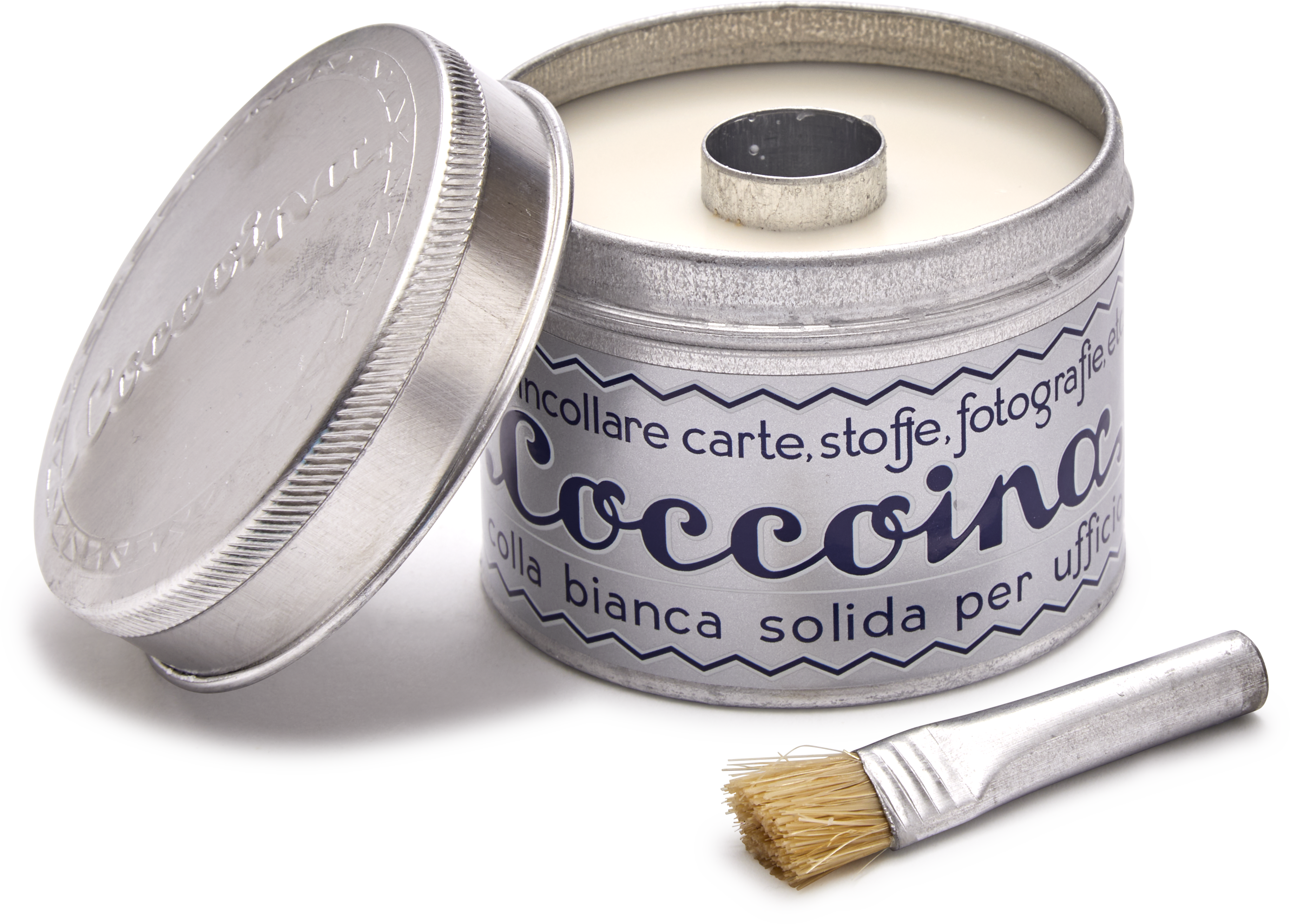 Coccoina was the original brand behind the cult almond or marizipan scented adhesive, still retailed in its classic aluminium tin and brush.
