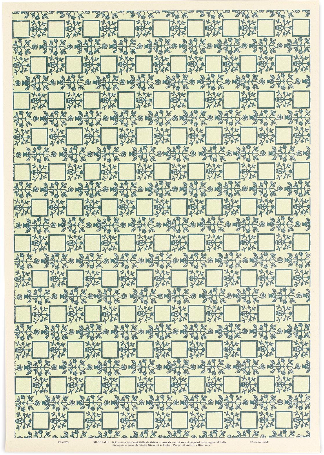 These contemporarily made paper sheets are carrying the torch for handprinted papers still produced in Italy today. The designs were first conceived in the 1930's and each one is directly representative of a particular Italian region - here presented: Venice.  Each motif is inspired by folk art, the patterns having been carefully developed from those found in various sources such as ceramics, carpets and engravings.
