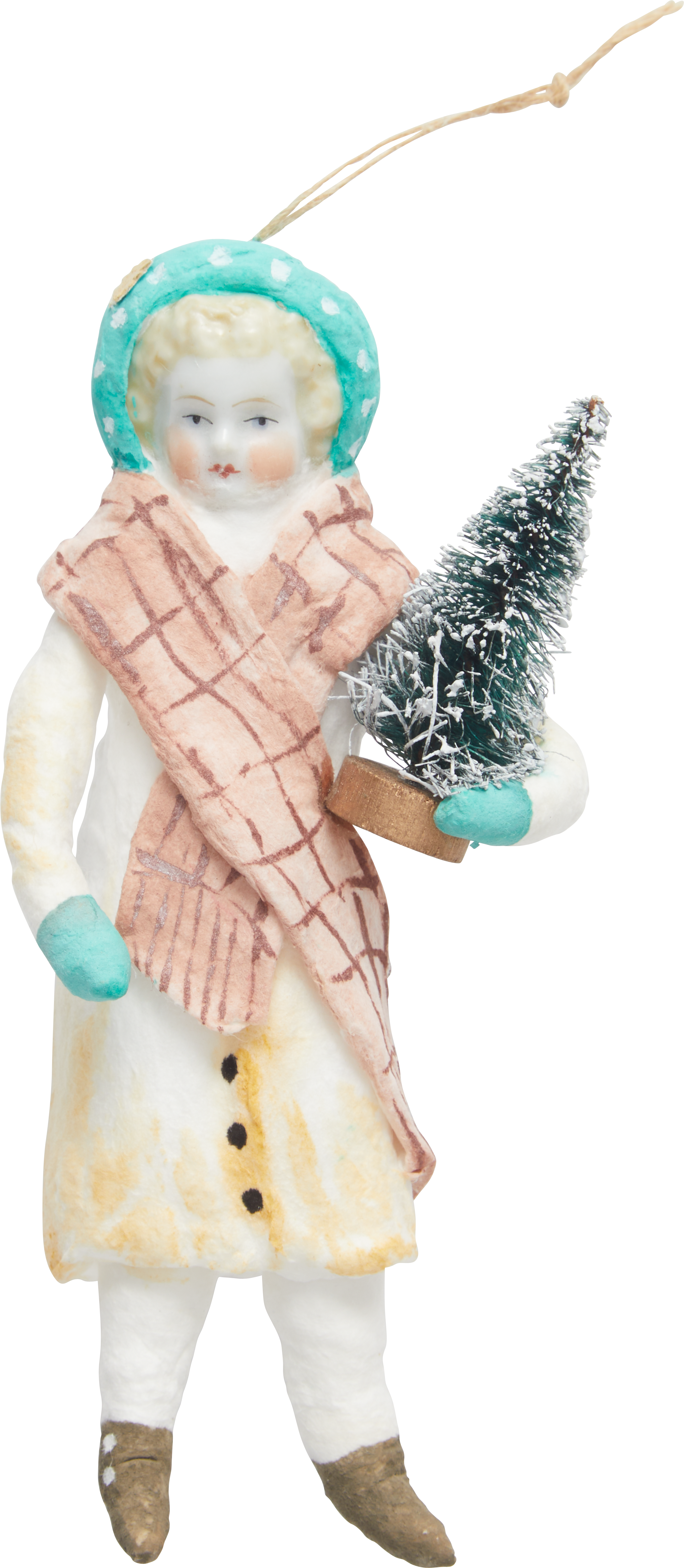These Spun Cotton Dolls are faithful replicas of ornaments from a bygone era - originating in 19th and early 20th century Germany. These were made by hand with cotton wadding around wire shapes and adorned with Dresden scrap embossed papers and other hand fashioned props, often featuring mushrooms Gluckspilz, a little trinket for luck. The porcelain faces used are original antique doll parts, which are extraordinarily secured some 100 years after they were disposed of as second quality or faulty by the doll makers of the past in the local village woods somewhere in Eastern Germany. Today in one of the strangest weekend hobbies, these are dug up like treasure by locals, or porcelain-foragers as we like to think of them, for your enjoyment. Surely the fact that each face has been buried in dirt for decades, destined to be forgotten, and brought back to life, given a new body and clothes, adds to their very eery, sometimes outright frightening demeanour and kooky form.