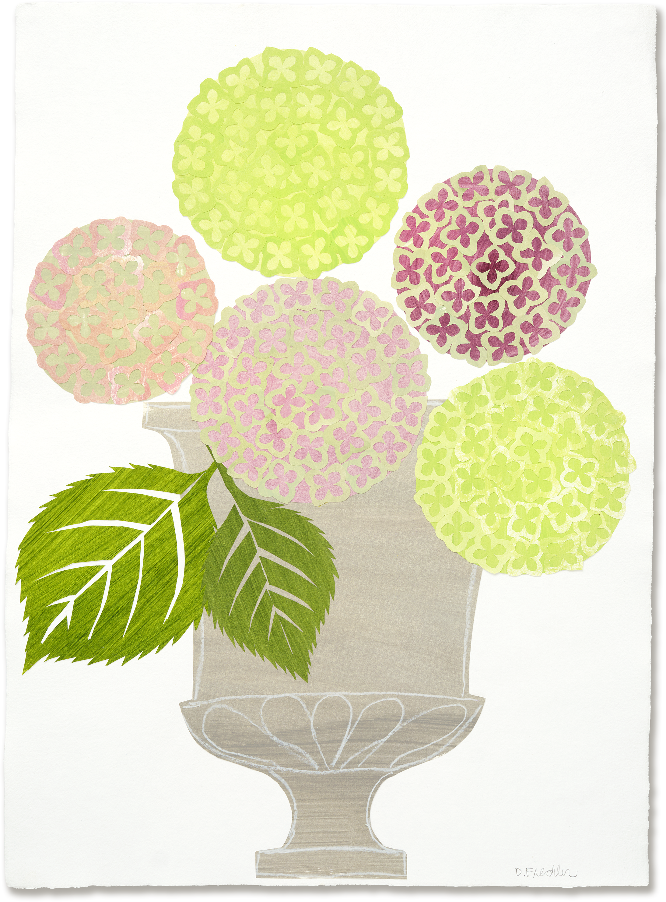 This pair of original collages by paper artist Denise Fiedler depict pink and green hydrangeas in an urn on a handmade paper. Pink hydrangeas are symbols of romantic love and tender feelings, whilst the green flowers represent rebirth and harmony.