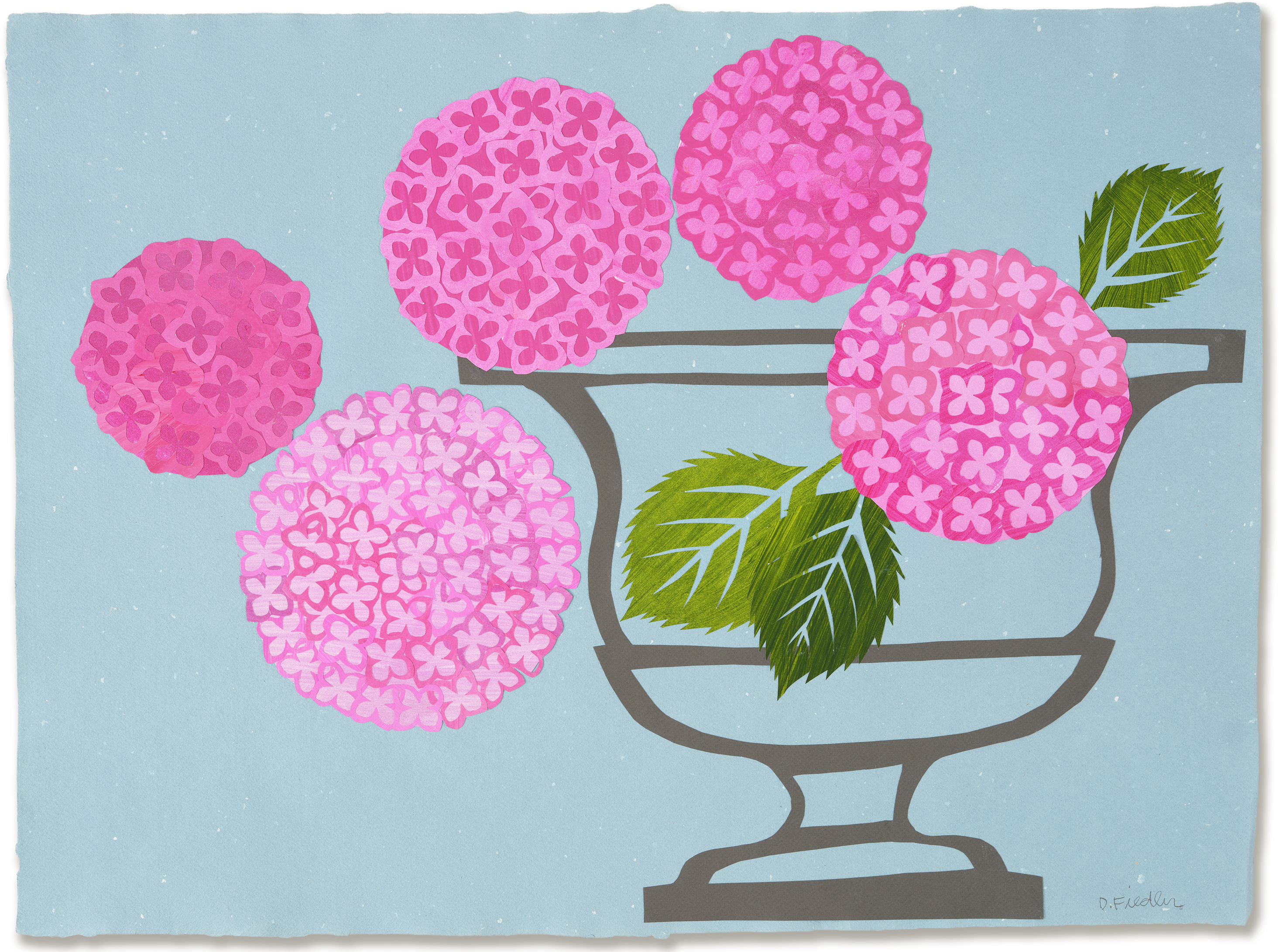 Denise Fiedler Floral Collage - 5 Magenta Hydrangeas in Grey Outline Urn on Blue Paper