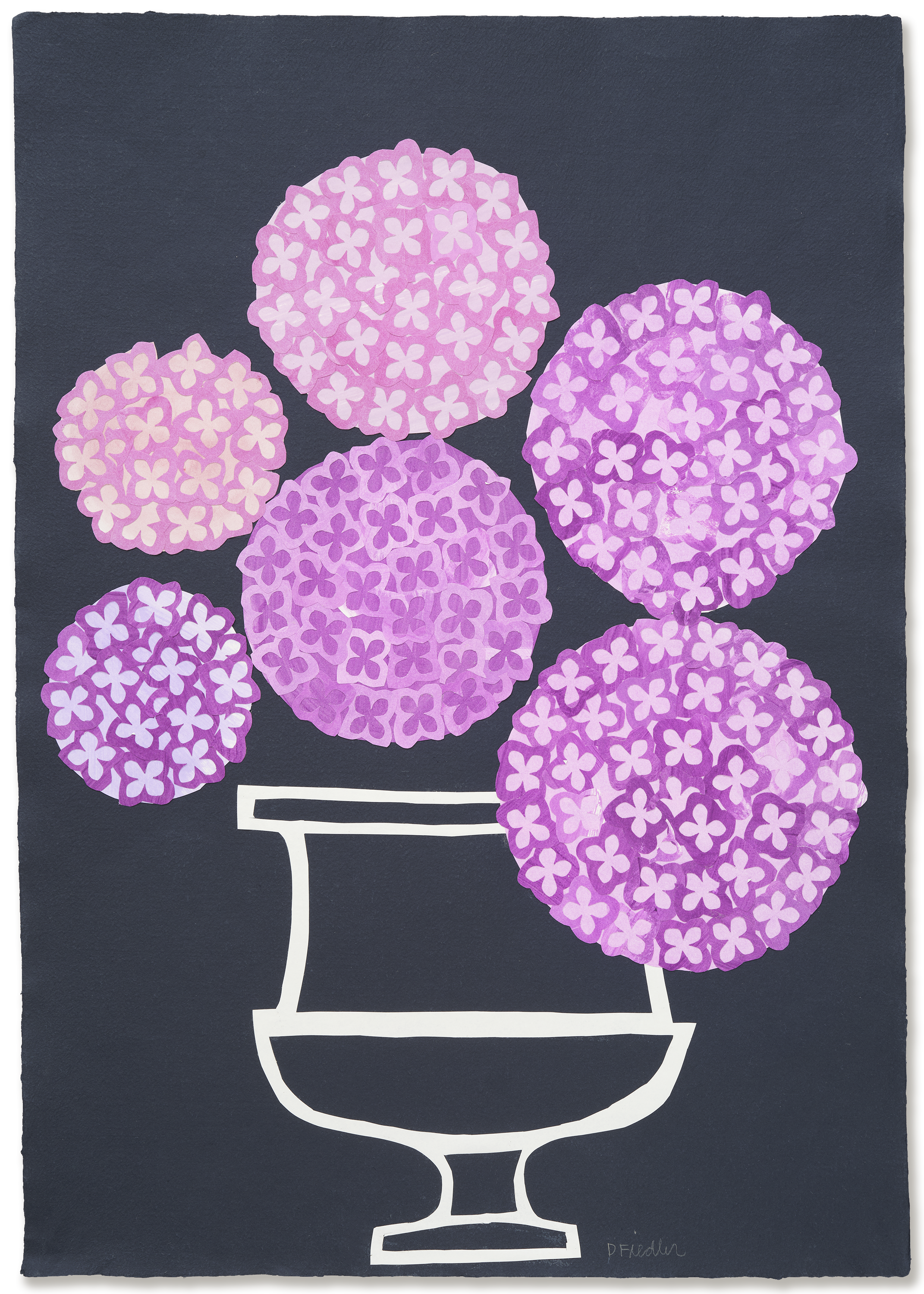 Denise Fiedler Floral Collage - 6 Pink Hydrangeas in White Outline Vase on Midnight Paper