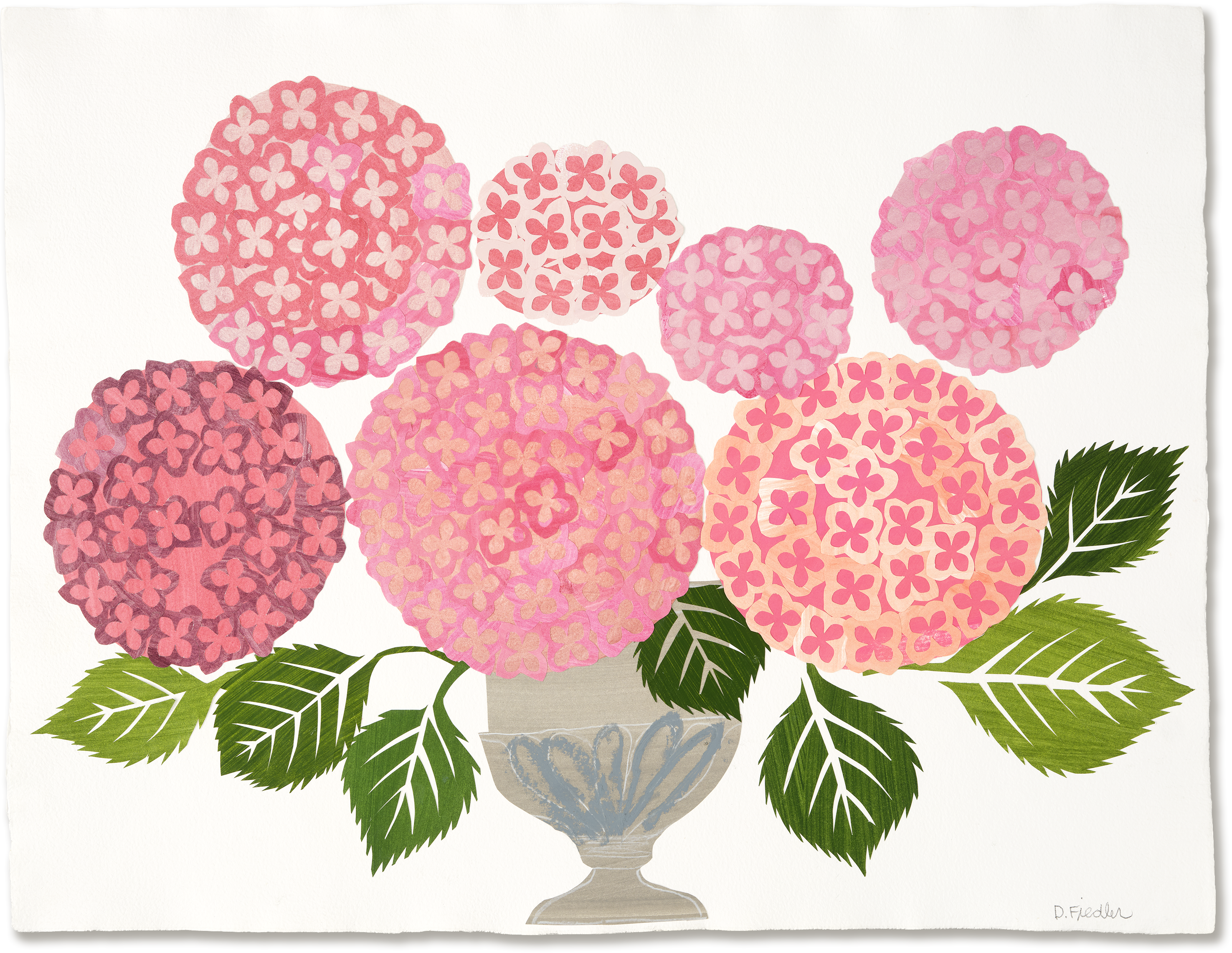 This original collage by paper artist Denise Fiedler depicts pink hydrangeas in a grey urn on a handmade paper. Pink hydrangeas symbolise romantic love and tender feelings.