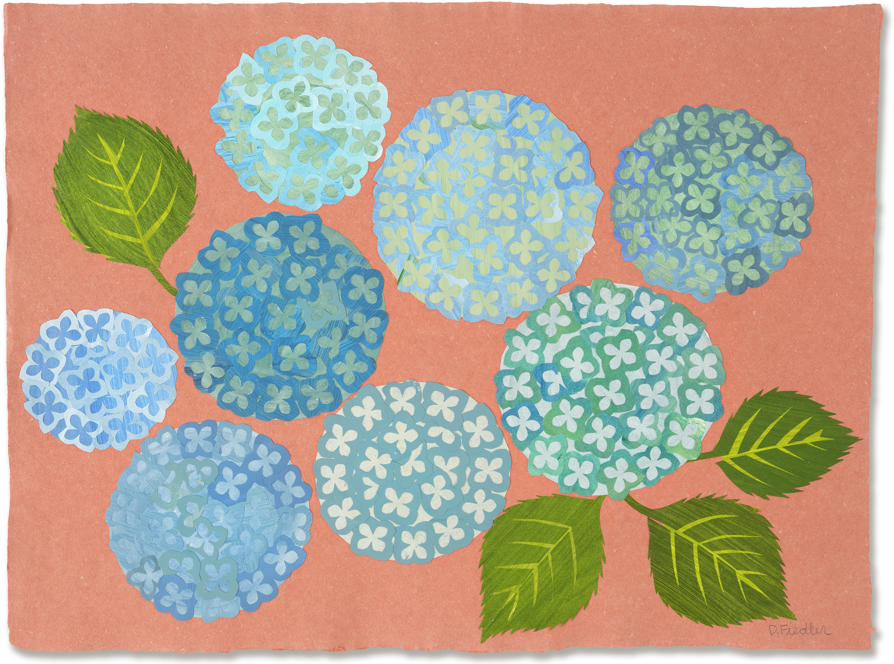 Denise Fiedler Floral Collage - 8 Blue/Green Hydrangea Heads on Orange Paper