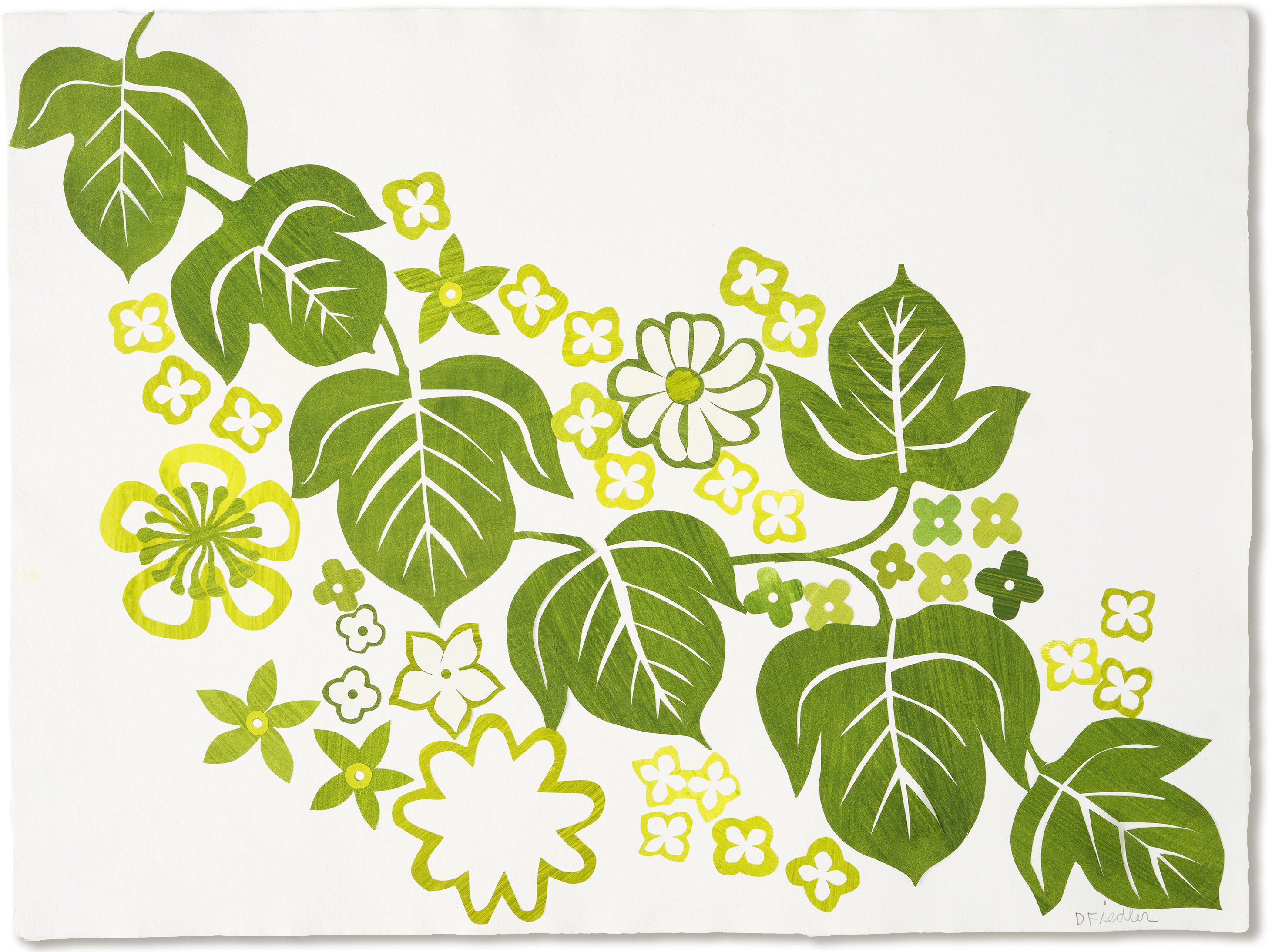 Denise Fiedler Floral Collage - Green Abstract Floral with Vine of 7 Leaves