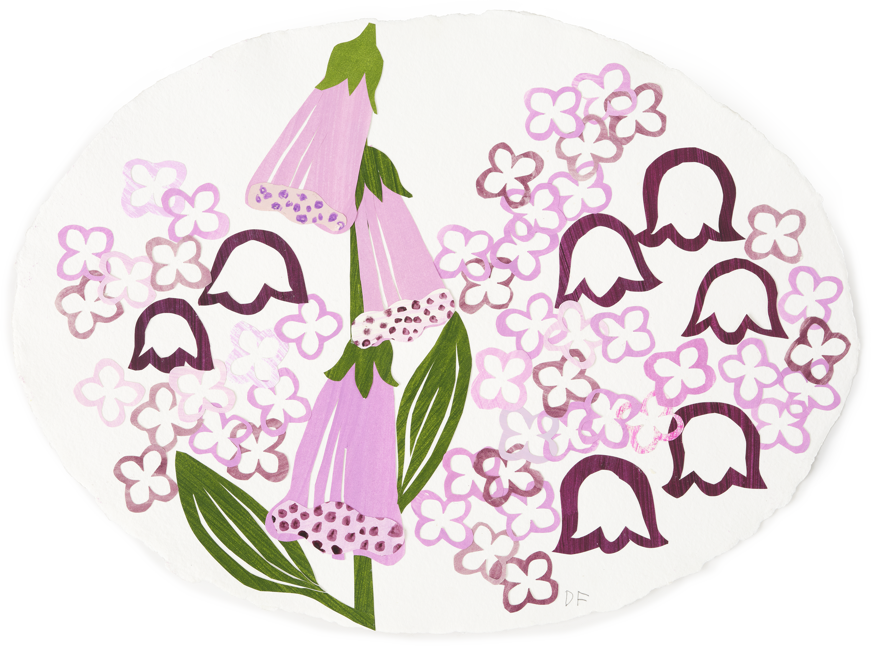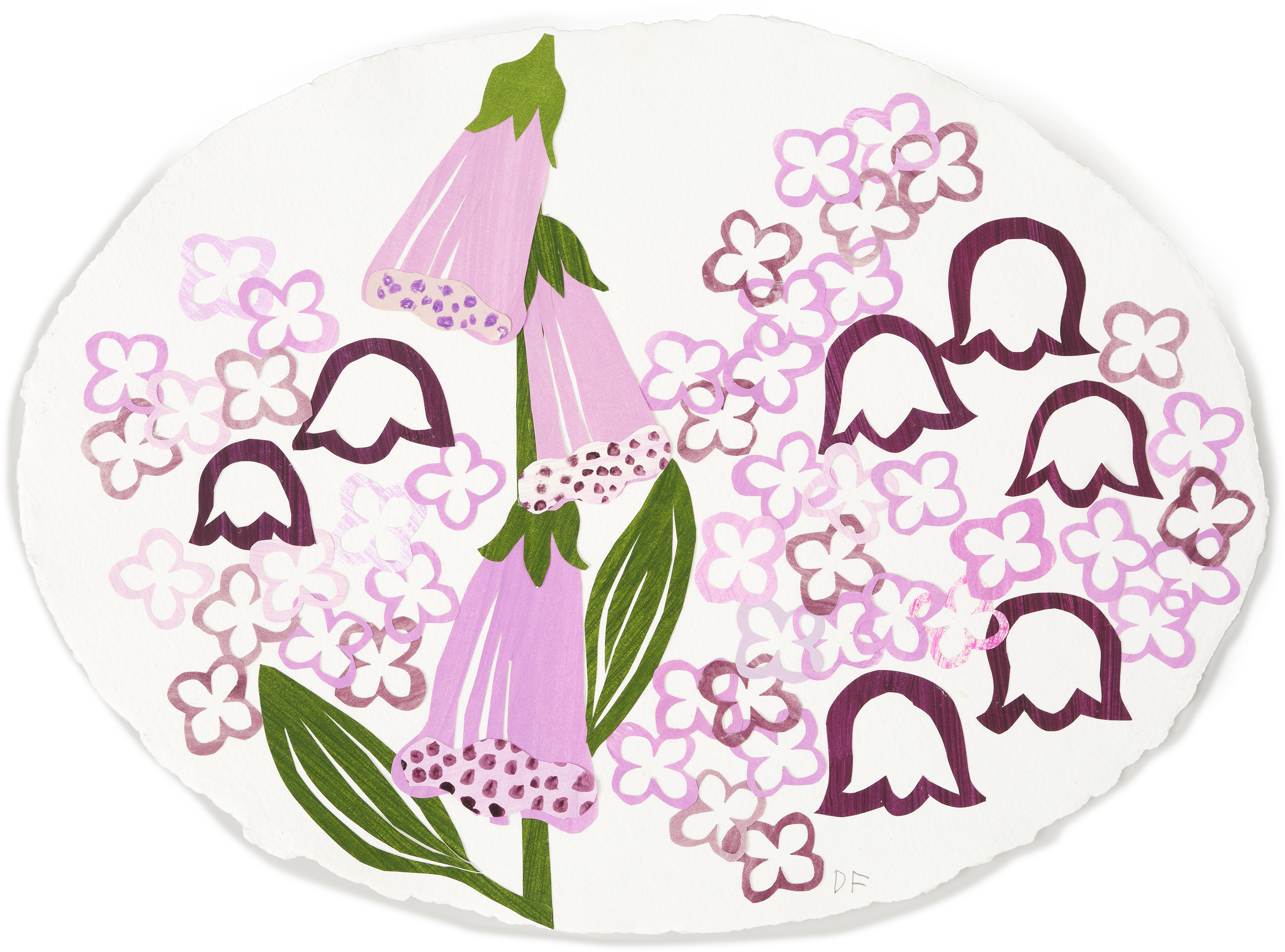 This original collage by paper artist Denise Fiedler depicts pink abstract florals and foxgloves on an oval shaped handmade paper. A favourite flower in an English country garden, the foxglove was named in Old English "foxes glofe" for its bell-shaped flowers; it was said to be worn by a fox to silence its movements on the hunt.