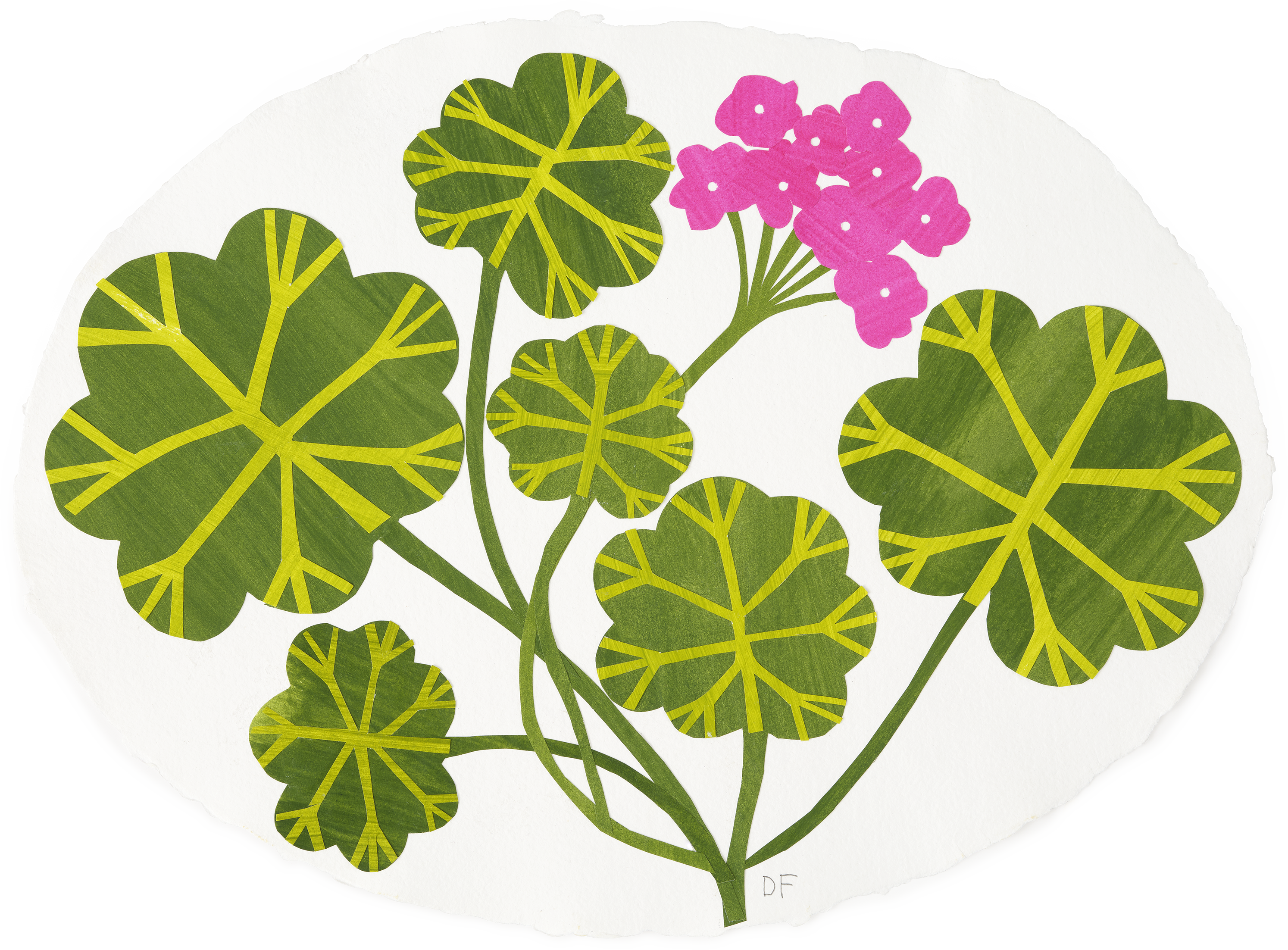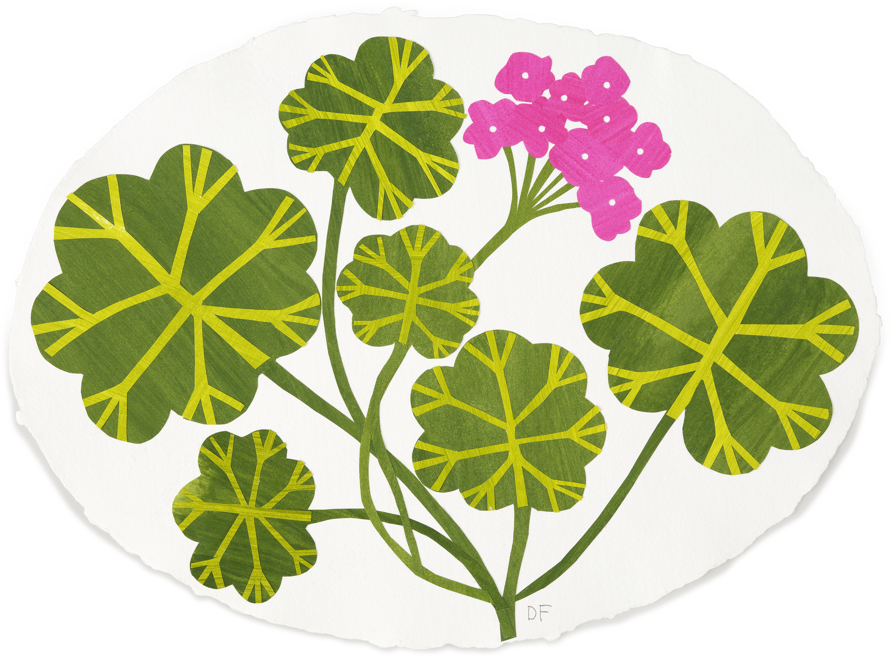 This original collage by paper artist Denise Fiedler depicts pink geraniums on an oval shaped handmade paper. The geranium is said to symbolise happiness, friendship, and good health in floriography.