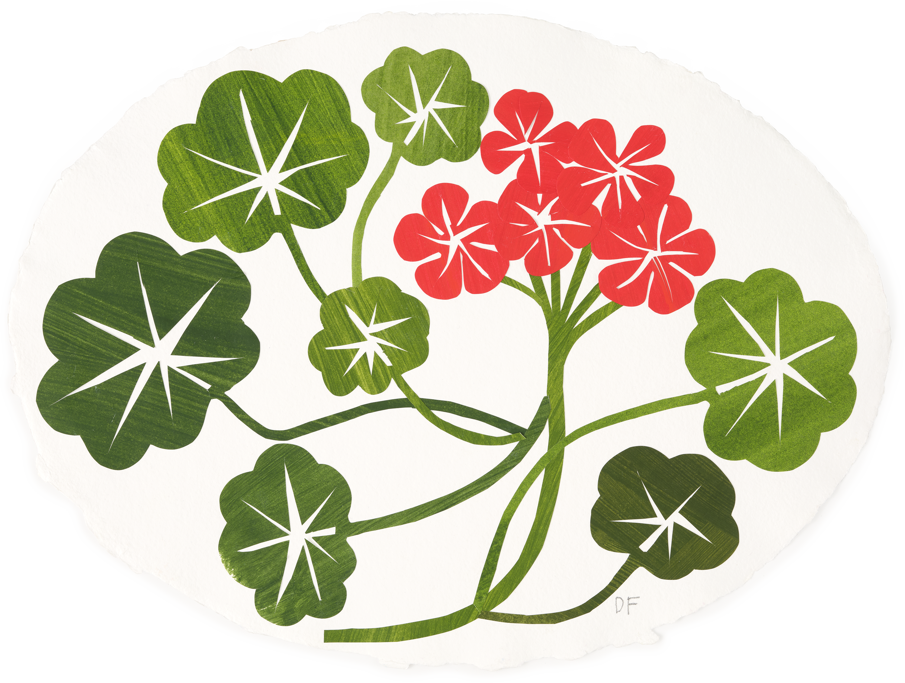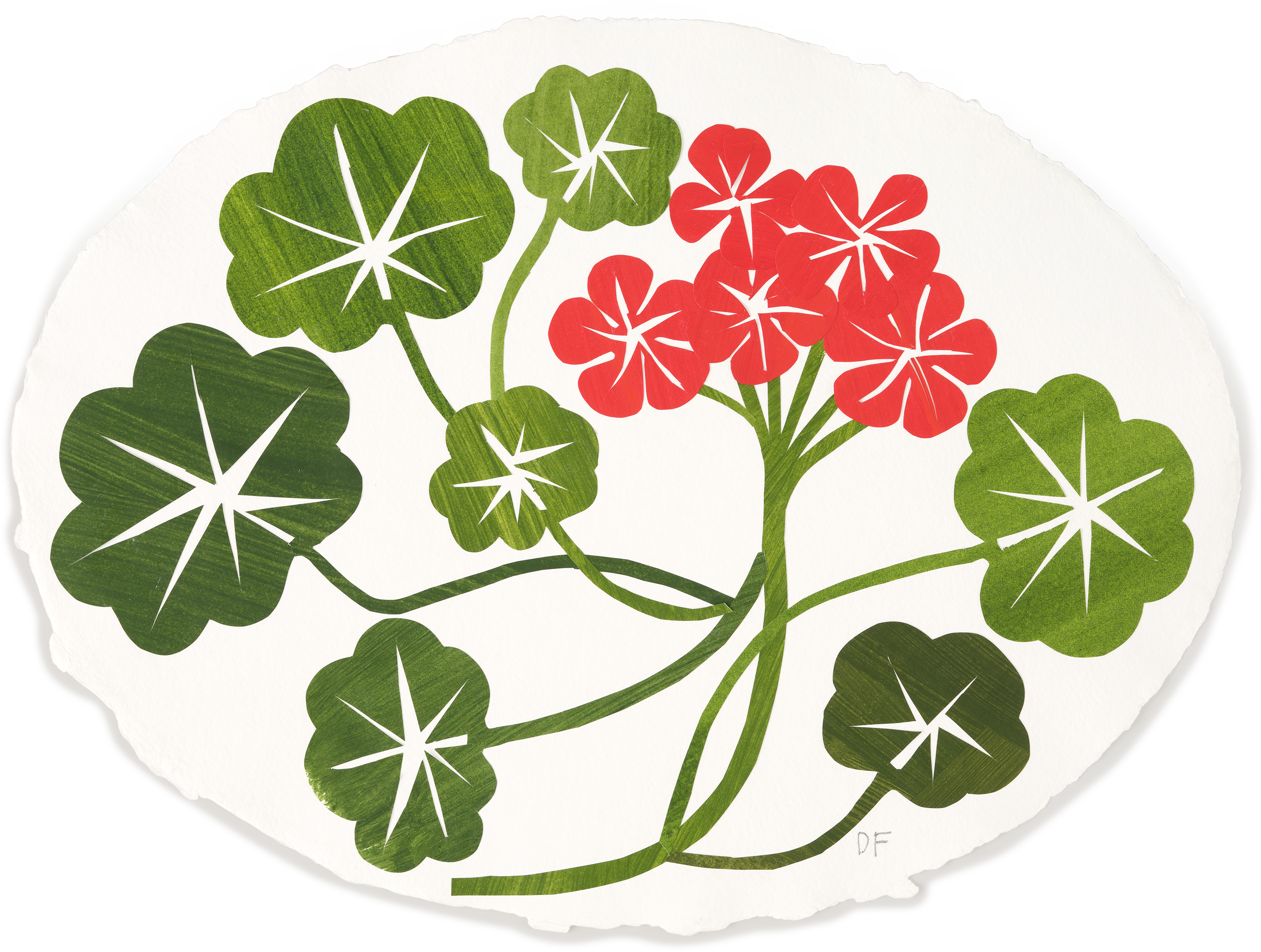 This original collage by paper artist Denise Fiedler depicts red geraniums on an oval shaped handmade paper. The geranium is said to symbolise happiness, friendship, and good health in floriography.