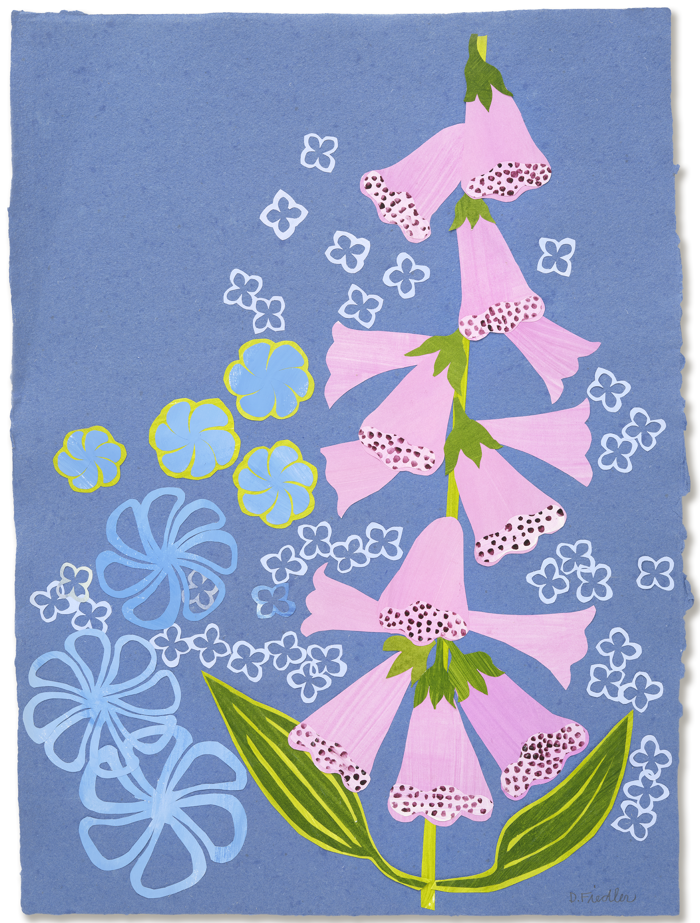 Denise Fiedler Floral Collage - Pink Foxglove on Denim Blue