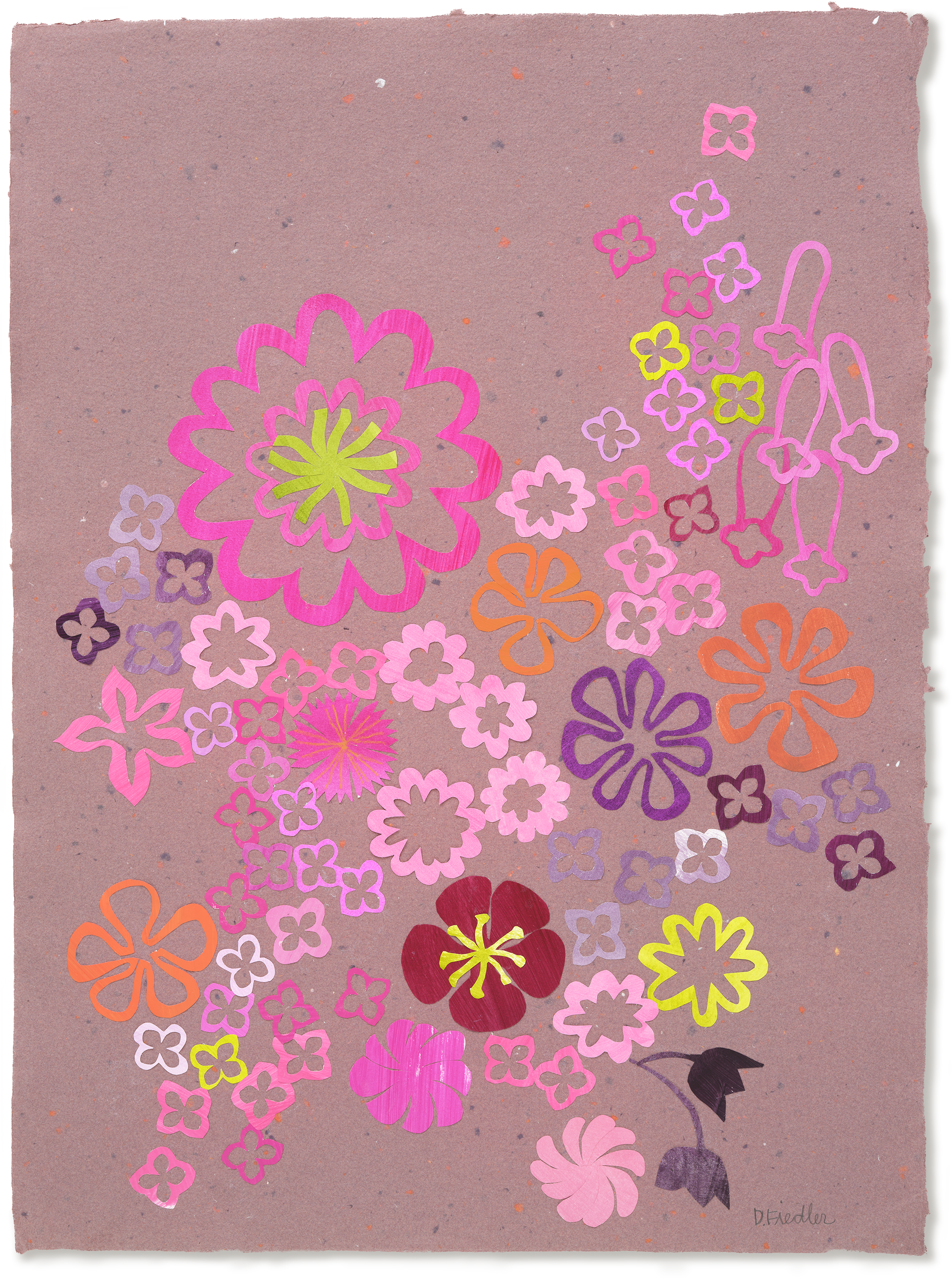 This original collage by paper artist Denise Fiedler depicts abstract florals on a handmade paper.