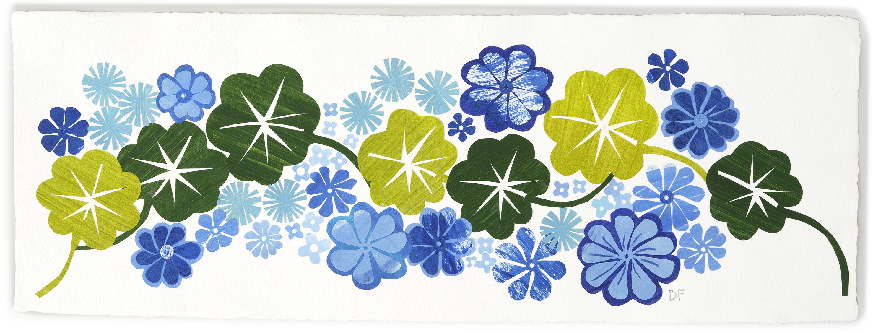 This original collage by paper artist Denise Fiedler depicts green and blue abstract florals on a rectangular handmade paper.