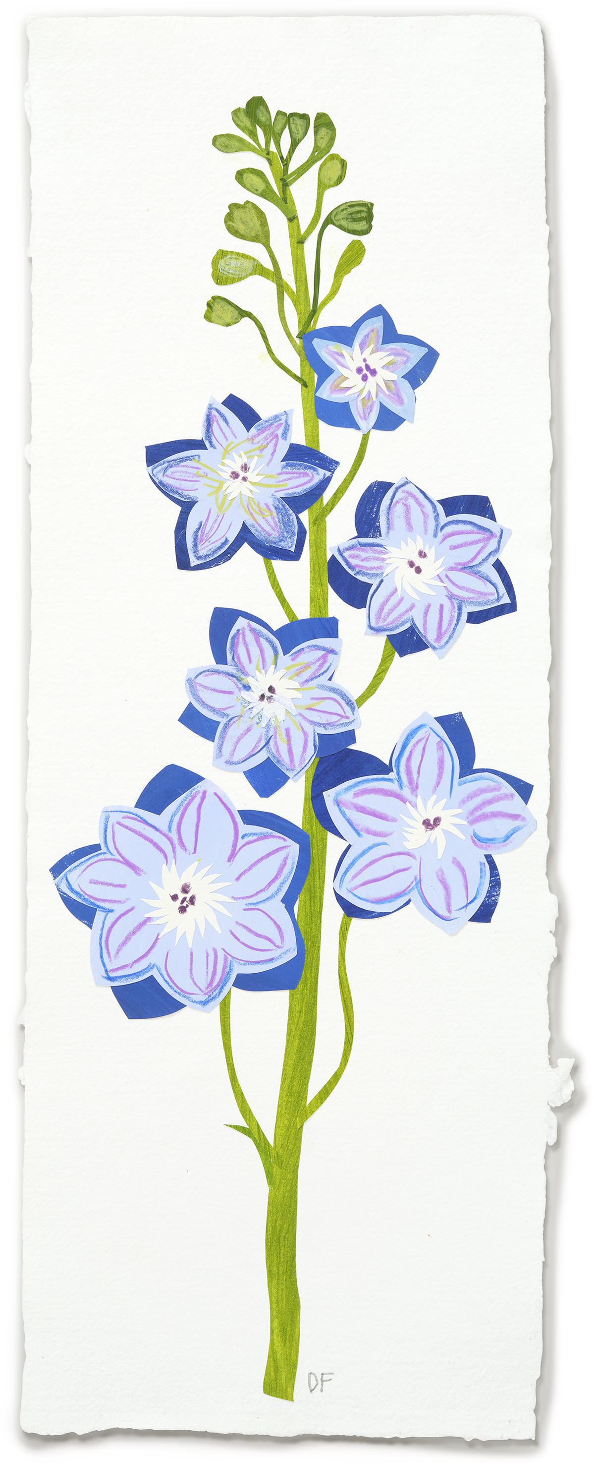 This original collage by paper artist Denise Fiedler depicts delphiniums on a rectangular handmade paper. Delphinium, or Larkspur - both names referring to their shape of a dolphin or a lark's claw - represent cheerfulness and protection in floriography.