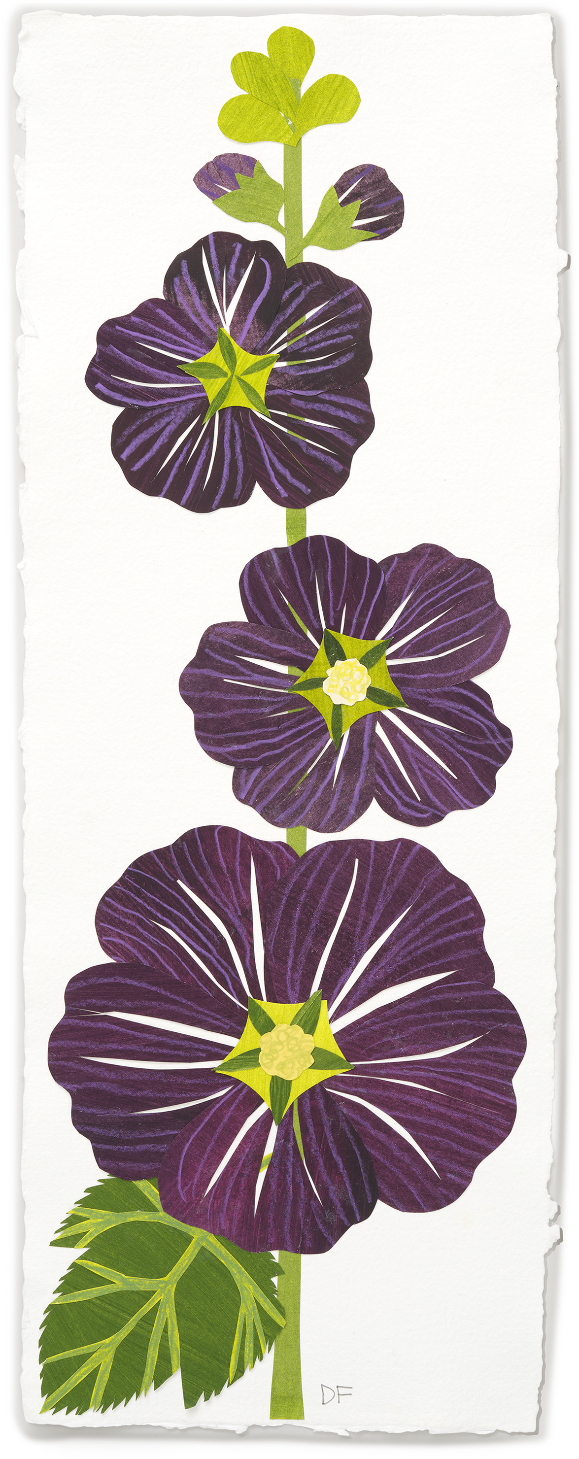 This original collage by paper artist Denise Fiedler depicts a plum hollyhock on a rectangular handmade paper. This popular ornamental garden plant, known for its height and brightly coloured flowers, represents fertility and ambition. The roots of the hollyhock were historically used for medicine and the stems still make for quality firewood!