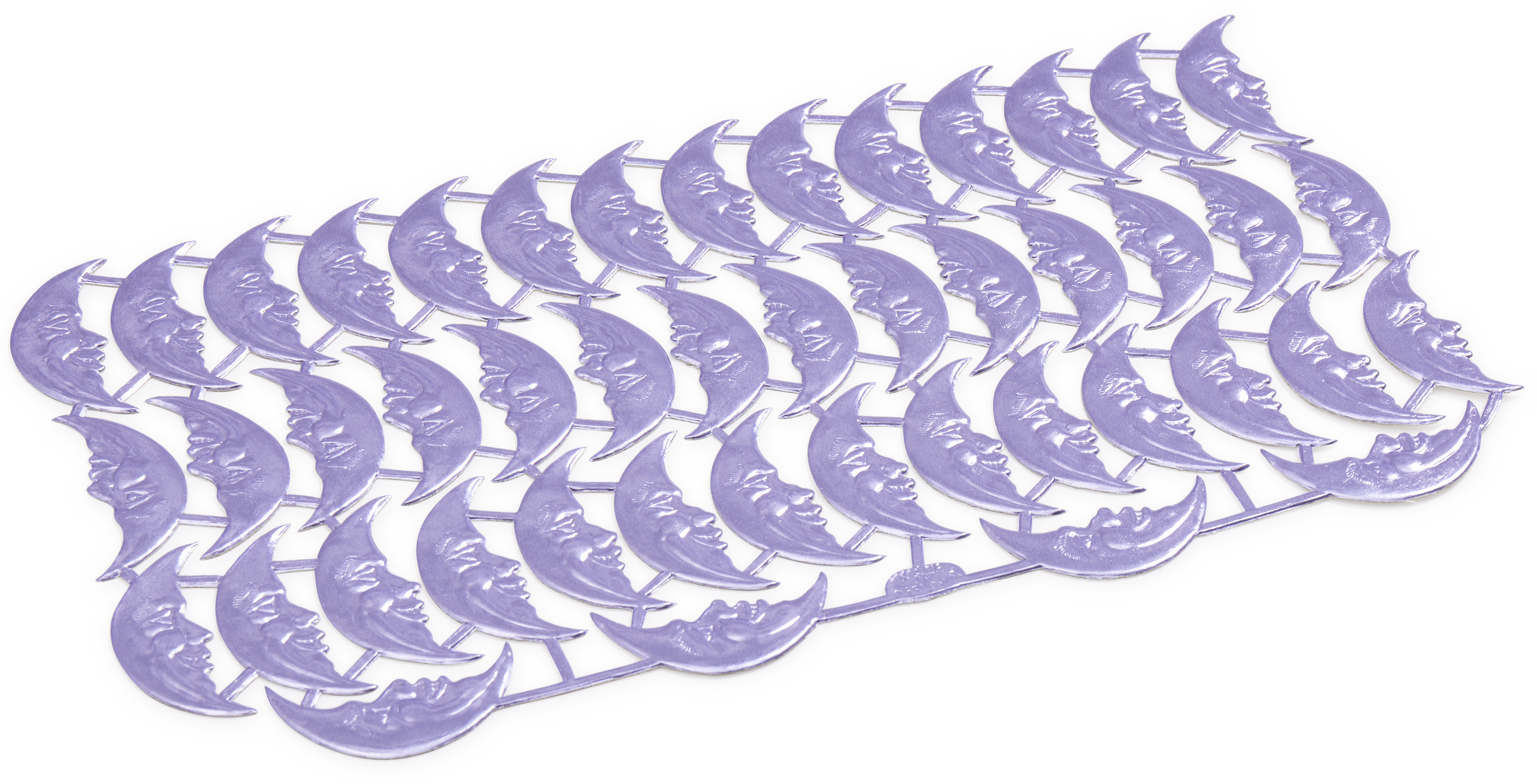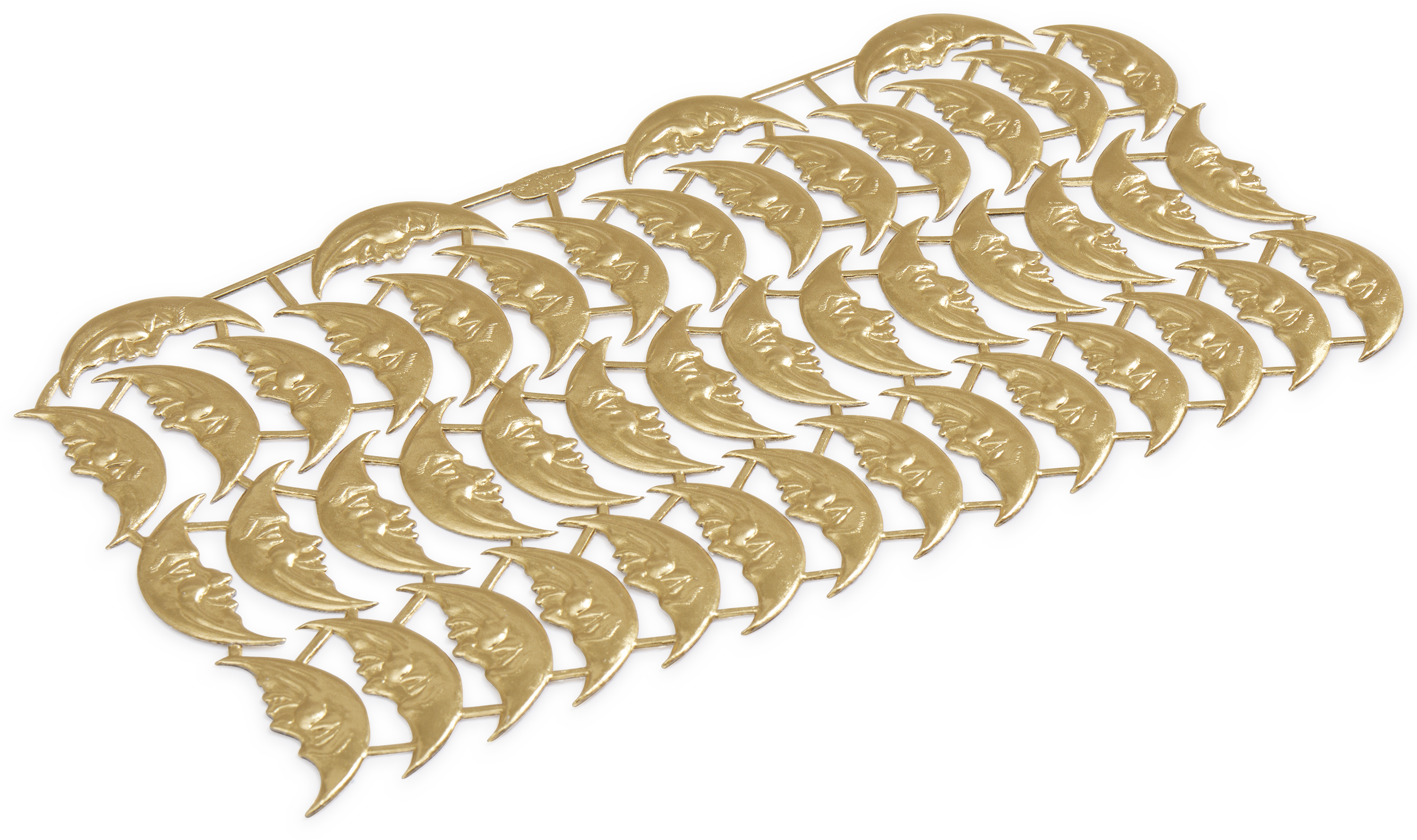 Enjoy these beautiful die-cut and embossed card scraps with half moons, made traditionally in Germany with metallic card. Use them as a retro embellishment for a gift wrap, stick some in your scrapbook or try your hand at making handmade cards and ornaments.