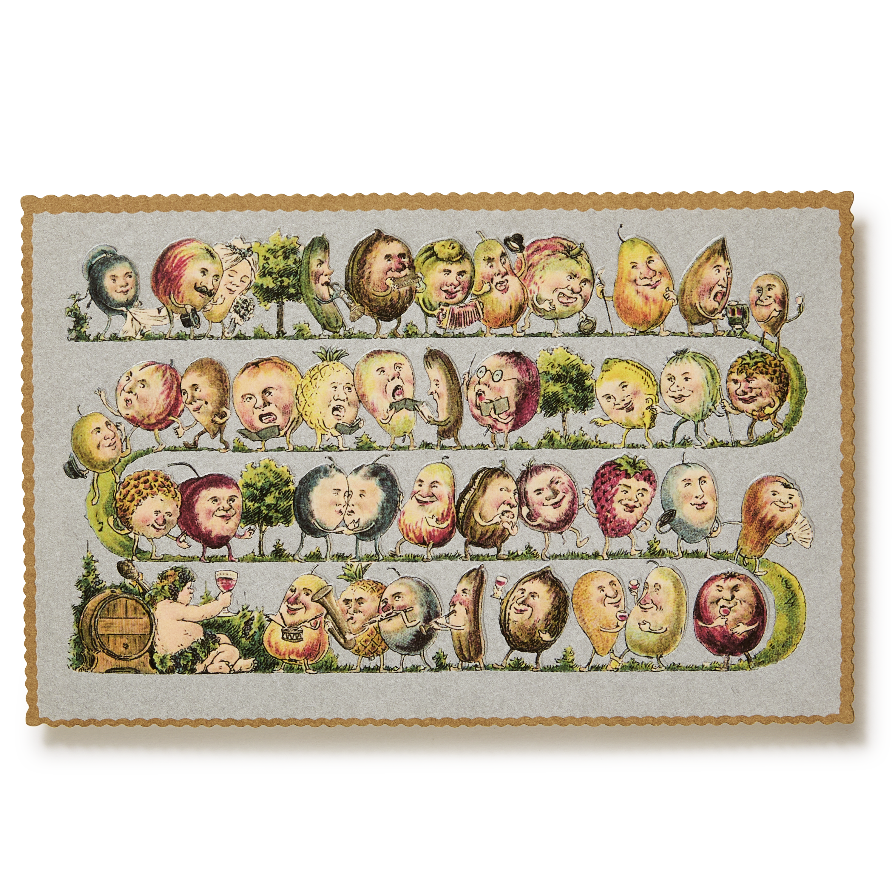 At the turn of the 20th century, postcards featuring personified fruit, courting cherries, mischievous pears, and apples with knowing expressions, captured the period’s taste for humour and allegory. Produced mainly in Germany and France, these images reflected a fascination with nature’s abundance filtered through the playfulness of Art Nouveau and popular illustration. Faithfully reproduced from the Choosing Keeping extensive collection of ephemera, these postcards have been carefully reprinted to match the distinctive colour palette and embossed texture of the originals, perfect for framing, sending, or collecting as curiosities from a time when even fruit had personalities.