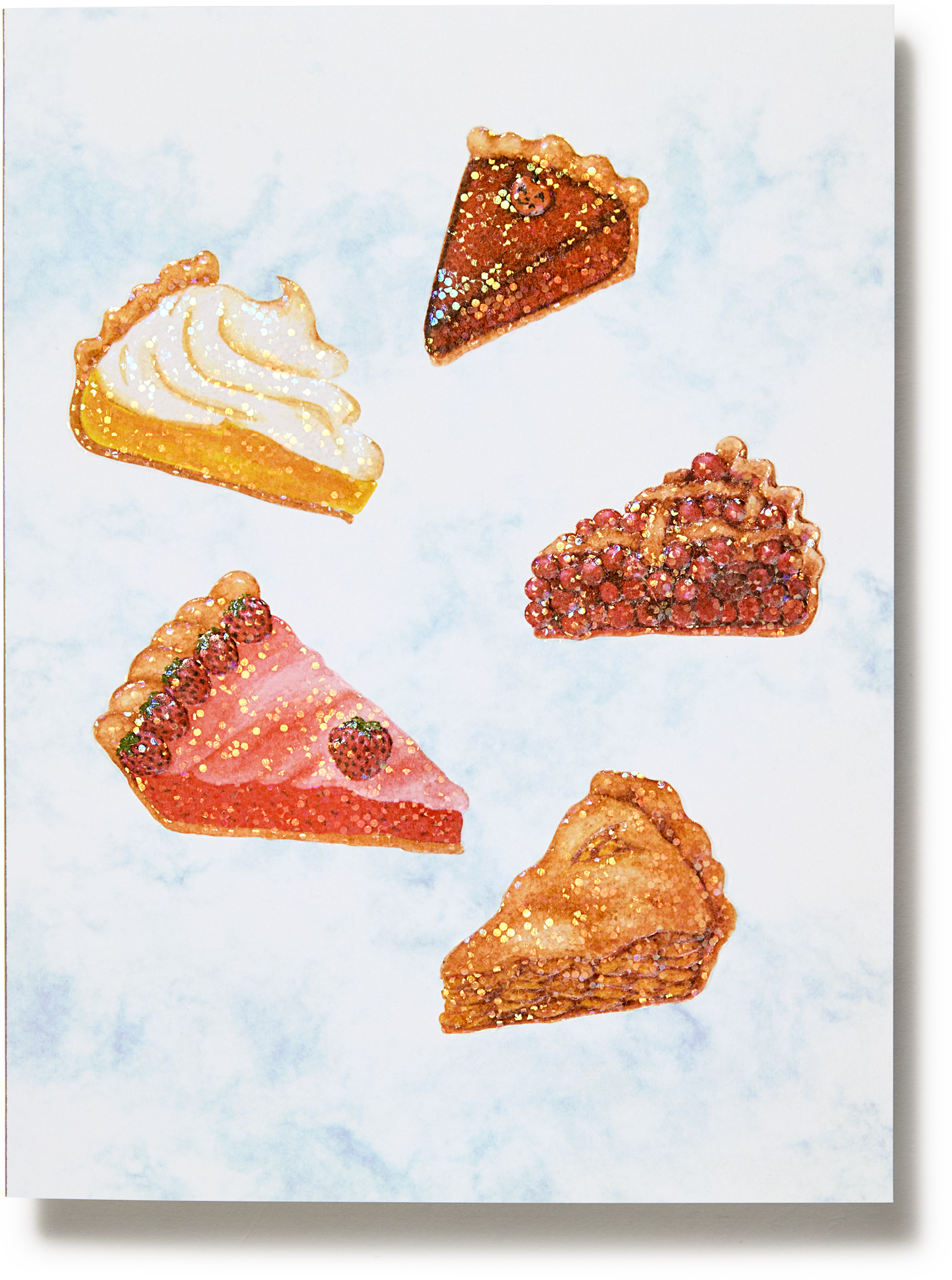 A very 80's inspired dream of pies falling from the sky - enjoy stiff peaks of meringue, carefully placed lattice and golden crust good enough to eat. Embossed and finished with holographic foil.