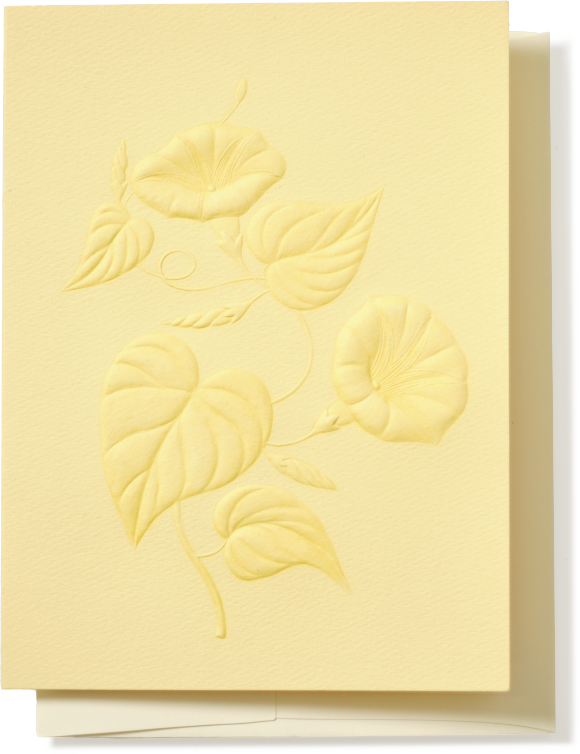 Morning glory, a flower of transient beauty, here today, gone tomorrow, this card symbolises the ephemeral. This greeting could be used as an elegant condolence card, subtly hinting at the fleeting nature of life and tension in its delicate beauty. In its more direct form, use this card to express feelings of bond and affection. Blind embossed on a cotton-like butter yellow textured paper, this card says quality and expert printing.