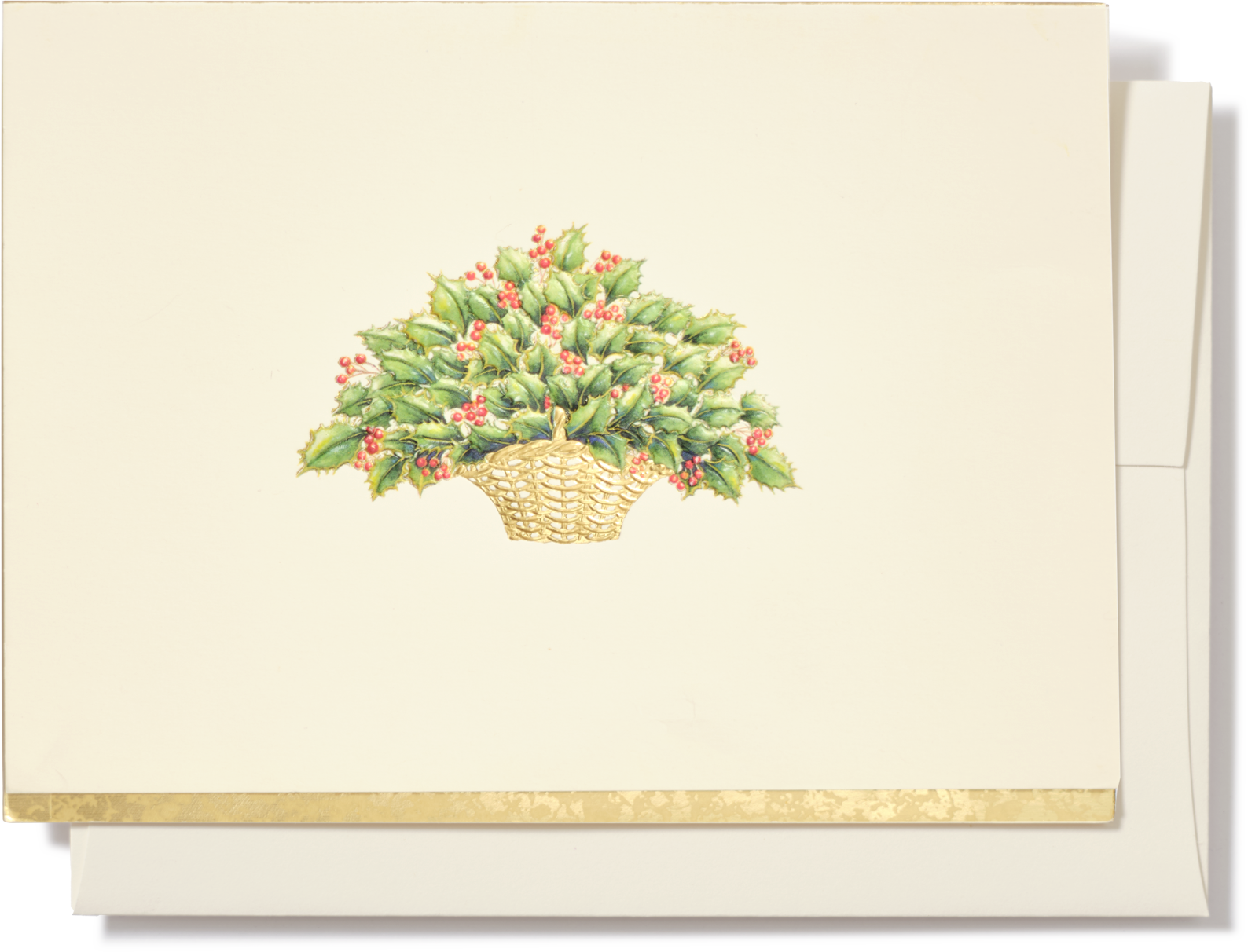 This card is expertly hand engraved with fine detail, very dainty gold elements and a deep embossed feel. Thematically and stylistically, I could imagine that these cards belong to the film set props of Home Alone (John Hughes) circa 1990 in the prerequisite red and green colours. A basket of Holly - all the ingredients are there for the essential classic Christmas theme in an all-American flavour.