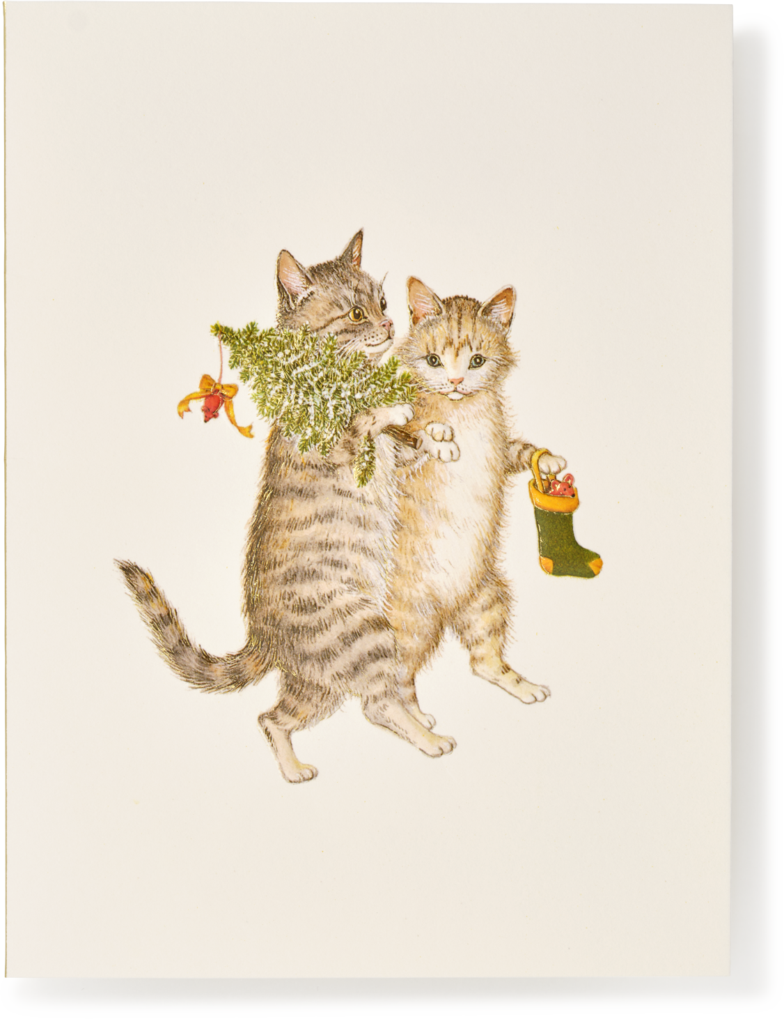 Cats have always been popular since the beginnings of Christmas greetings in Victorian times when anthropomorphic chraracters were a popular thematic. Continue this historic tradition with this joyful couple of kitties, depicted using expert printing techniques, including fine detail, dainty gold elements and a deep embossed feel - sure to make the cut for a place on the mantelpiece.