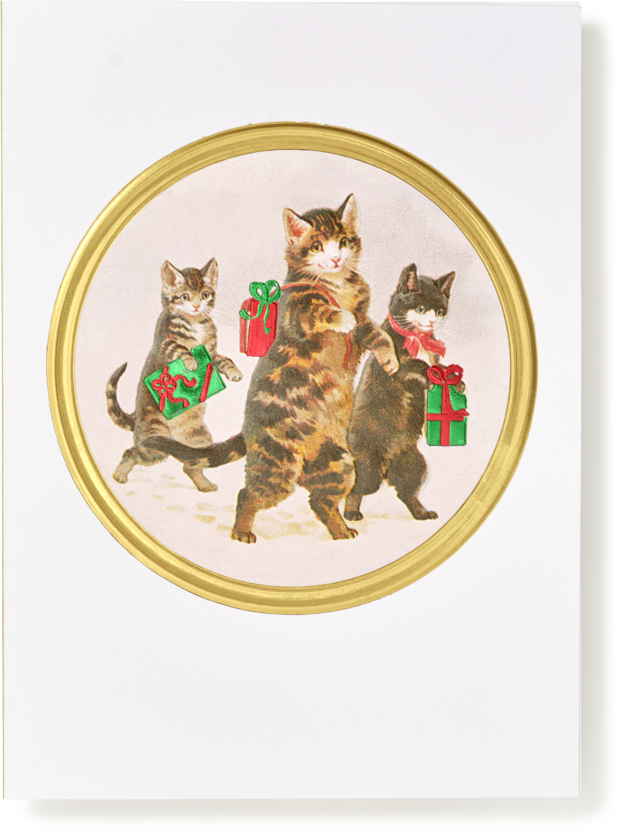 Cats have always been popular since the beginnings of Christmas greetings in Victorian times when anthropomorphic chraracters were a popular thematic. Continue this historic tradition with this joyful trio of kitties, depicted using expert printing techniques, including fine detail, dainty gold elements and a deep embossed feel - sure to make the cut for a place on the mantelpiece.