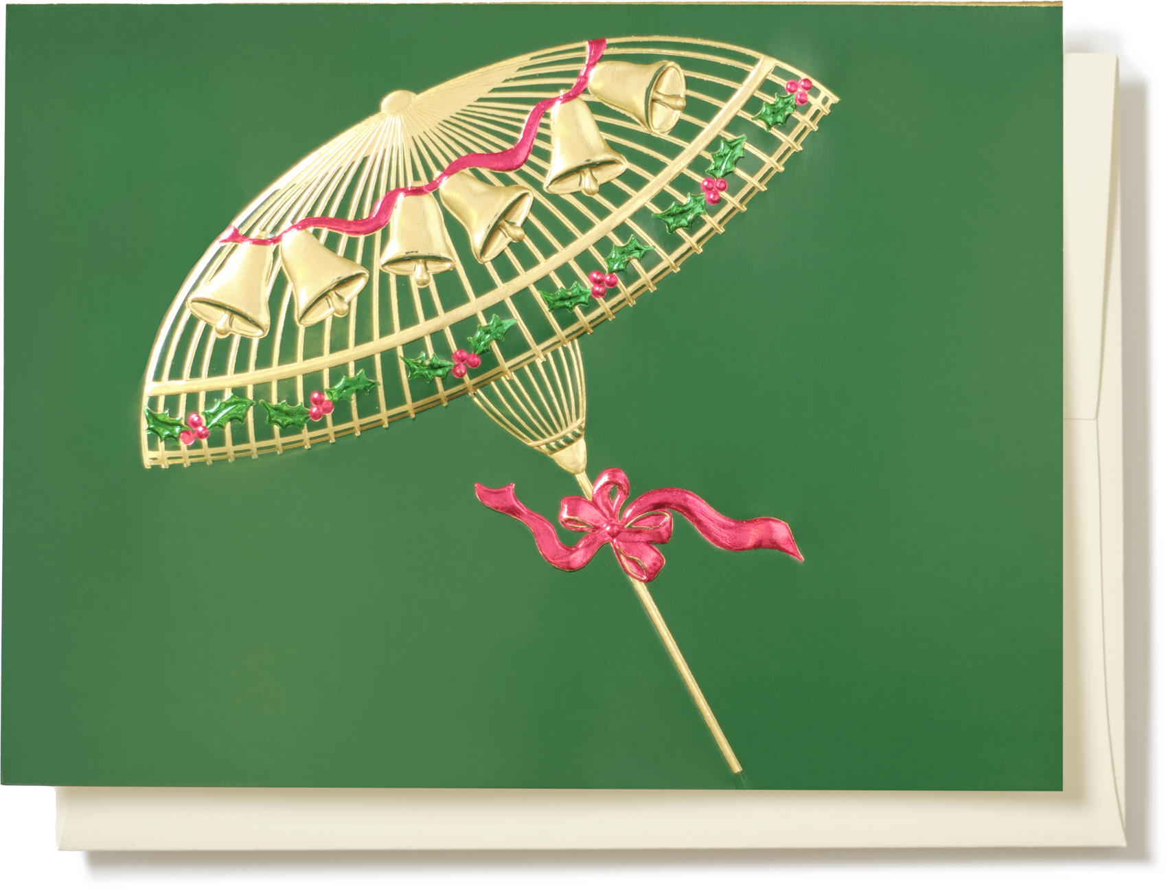 This card is expertly hand engraved with fine detail, very dainty gold elements and a deep embossed feel. Thematically, designed in the 90s, these have the elusive Americana feeling familiar to any self-respecting millennial growing up around the USA. This card features a high gloss lacquerware-like finish, contributing to the Japanese-Christmas theme explored in this celebratory umbrella and bells.
