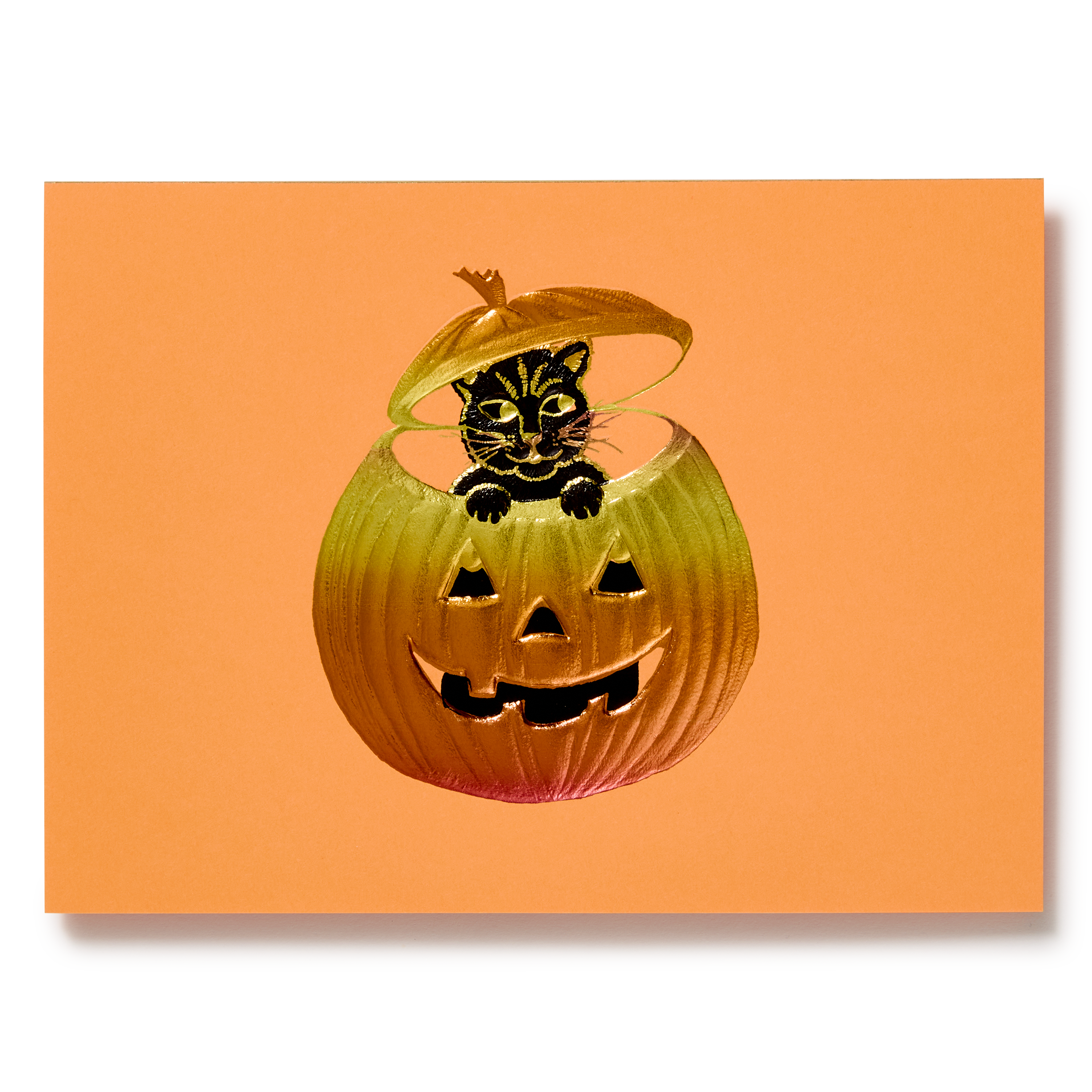 All talents in printing are on show here - multiple foils, deep embossing, die cutting all in perfect registration for an incredible 3D effect. If that's not enough, there is also the adorable design of 'cat-in-pumpkin' in halloween classic iconography.