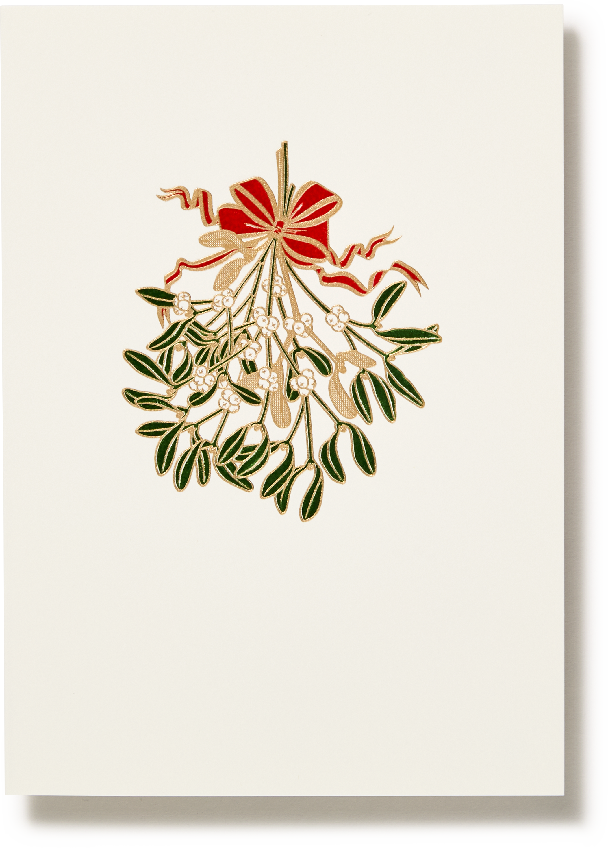 Part of the traditional Christmas flora alongside holly and poinsettia, enjoy this bough of mistletoe bundled up with scarlet ribbon. The textured, almost filigree-like application of the gold accents makes this card unique and exceptionally beautiful.