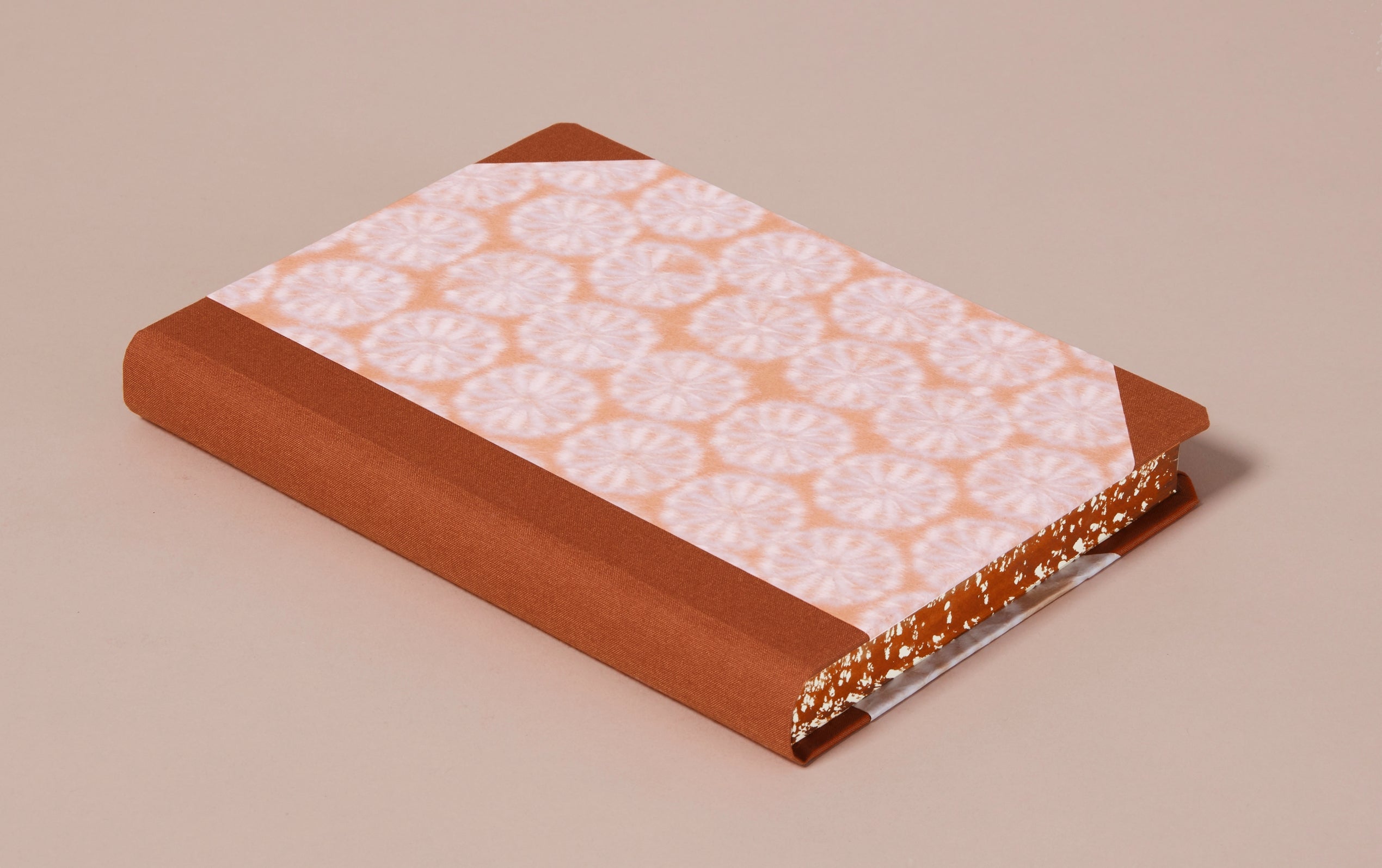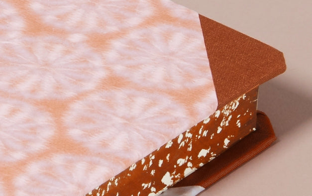 Our version of the age-old composition notebook. Here decorated with exquisite handmade Echizen Washi Japanese patterned papers for the cover and matching hand sponged page edges. This paper features a Chrysanthemum patterned shapes in an eye puzzling way from the paper's internal hemp fibres. Hardback cover and linen spine make this a very robust and durable writing companion as well as a beautiful notebook for special occasions and projects.